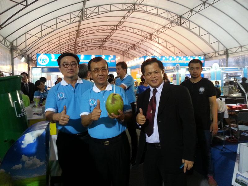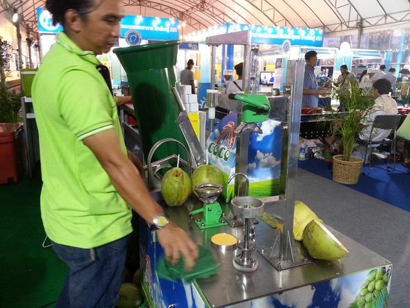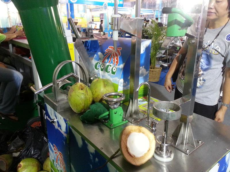 เริ่มกันที่เอาใจคนชอบรับประทานมะพร้าวกันก่อน กับเครื่องเจาะ ดูด ตัดมะพร้าว เป็นเครื่องขนาดใหญ่ ทำงาน 3 ขั้นตอน ตั้งแต่เจาะลูกมะพร้าวด้วยท่อเหล็กแหลมแล้วดูดเอาน้ำมะพร้าวออกมาได้หมดจด ไม่หกแม้แต่หยดเดียว จากนั้นนำลูกมะพร้าวมาตัดครึ่งด้วยมีดยาว เพื่อนำเนื้อมะพร้าวมาใช้ประกอบอาหาร
