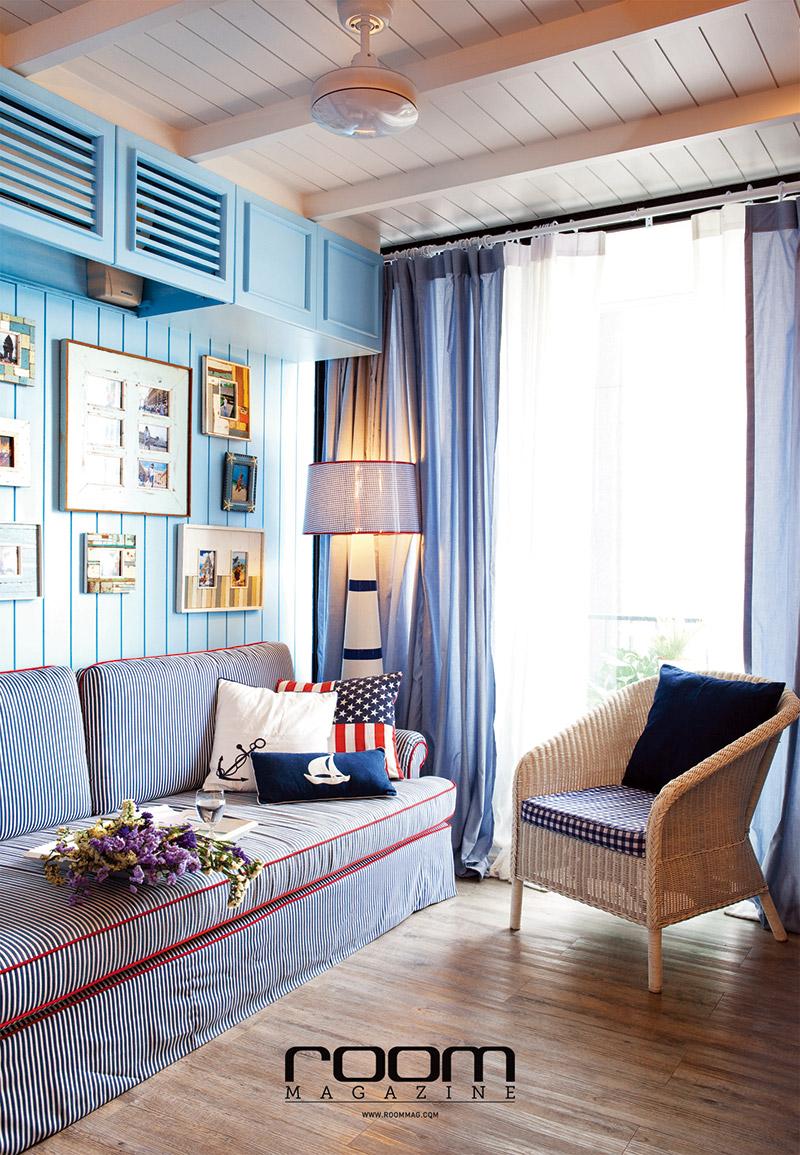 นอกจากจะทำบิลท์อินตู้เก็บของเหนือโซฟาแล้ว อย่าลืมทำบิลท์อินเพื่อซ่อนเครื่องปรับอากาศไว้ภายใน โดยการทำหน้าบานตู้ตีเกล็ดเว้นช่องด้านข้าง ข้างละ 10 เซนติเมตร สำหรับการระบายลม ขนาด 40X100x40 เซนติเมตร แล้วทำสีฟ้าเฉดเดียวกับตู้และผนัง เพียงเท่านี้คุณก็ได้หน้ากากแอร์สีหวานดูกลมกลืนกับห้องแล้ว