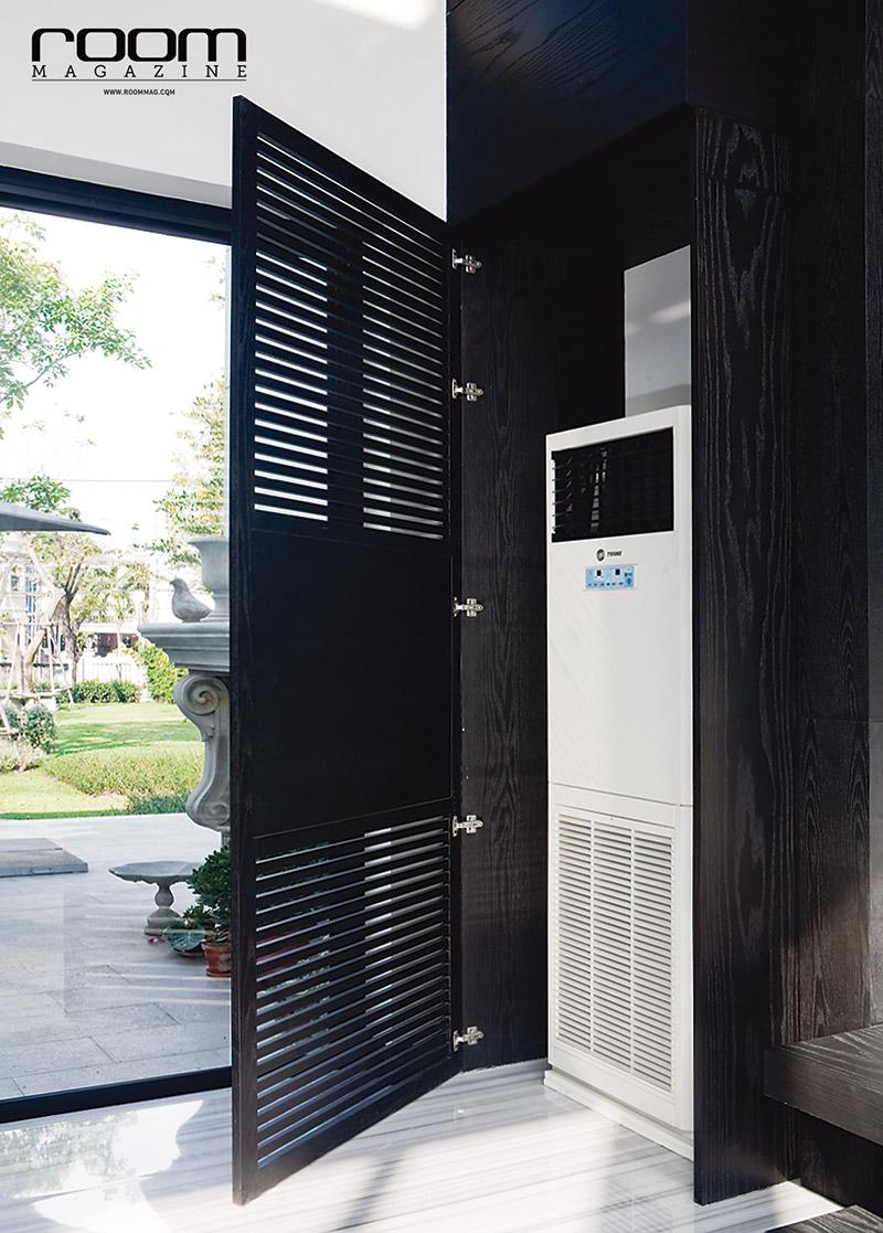ทำตู้ซ่อนเครื่องปรับอากาศแบบตั้งพื้นไว้ภายในผนัง ปิด-เปิดด้วยหน้าบานตู้ไม้ตีเว้นร่องให้ตรงกับช่องระบายอากาศเพื่อการกระจายลมที่ดี ไอเดียนี้ช่วยให้ห้องดูเป็นระเบียบ ไม่เกะกะ เพียงปิดบานตู้ลงก็จะดูกลมกลืนเป็นส่วนหนึ่งของผนัง