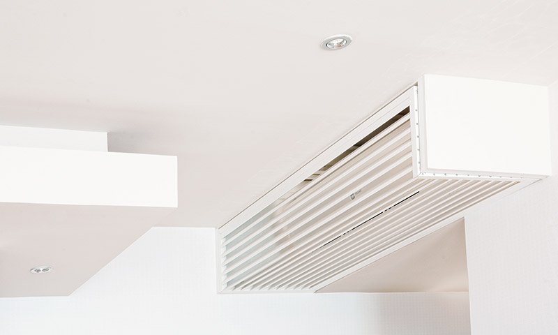 ออกแบบฝาครอบปิดเครื่องปรับอากาศโดยใช้แนวซี่อะลูมิเนียมอบสีขาว แล้วยึดฉากอะลูมิเนียมและเส้นอะลูมิเนียมด้วยนอตให้แข็งแรง ไอเดียนี้ช่วยให้ฝ้าเพดานดูสวยงาม เรียบร้อย และสามารถเปิด-ปิดบำรุงรักษาเครื่องปรับอากาศได้สะดวก