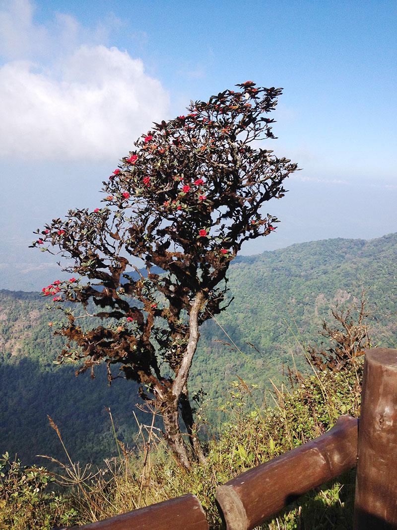 ลักษณะสภาพอากาศที่หนาวเย็นตลอดปี และเป็นป่าดิบเขากับทุ่งหญ้าบนสันเขา มีพรรณไม้ที่สำคัญคือ กุหลาบพันปี สีแดงสดรวมถึงพรรณไม้อีกหลายชนิด สลับกับบางช่วงเป็นทุ่งหญ้าโล่ง มีไอหมอกมากระทบใบหน้าเบาๆ ให้นักท่องเที่ยวได้สัมผัสความงดงามและอากาศที่สดชื่นตลอดระยะทาง 3 กิโลเมตร