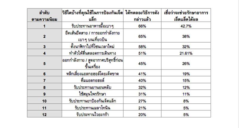 นอกจากนี้ผู้ถูกสำรวจยังได้จัดอันดับวิธีป้องกันเจ็ตแล็กที่ได้ผลที่สุด ถึงแม้ว่าผู้โดยสารส่วนใหญ่จัดให้การออกกำลังกายเบาๆ และรับประทานอาหารที่มีประโยชน์เป็นวิธีที่ได้รับความนิยม แต่มีเพียงประมาณครึ่งหนึ่งเท่านั้นที่ได้ลองทำวิธีนี้แล้วพบว่าได้ผลในการบรรเทาอาการต่างๆ จากการเดินทางระยะไกล