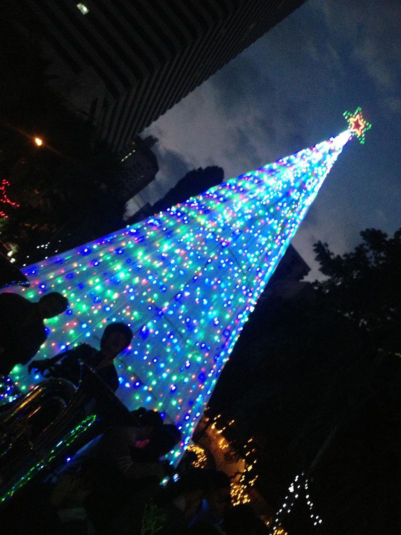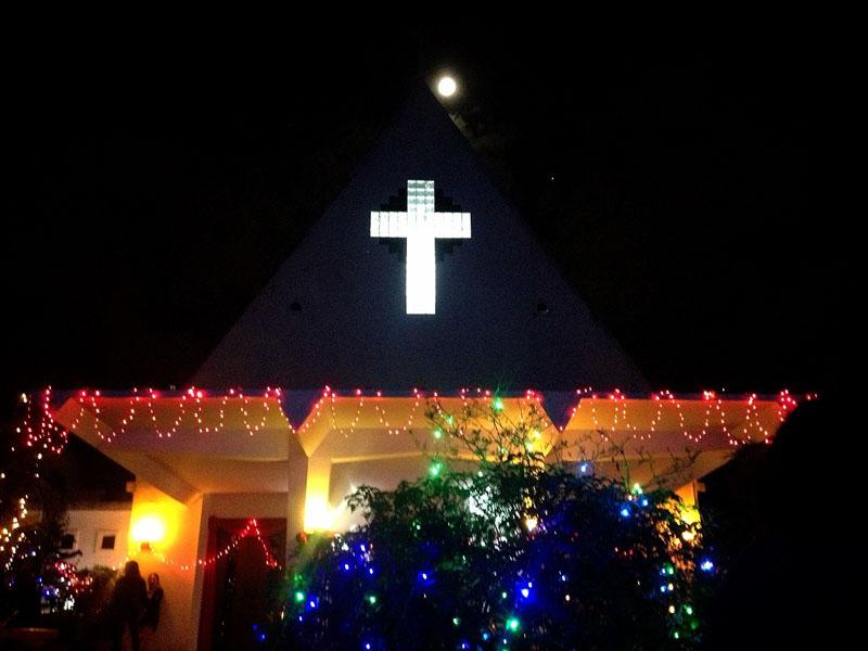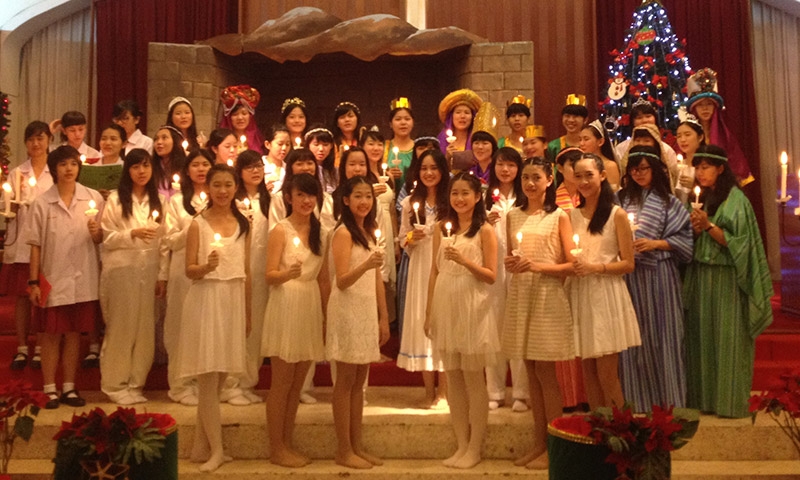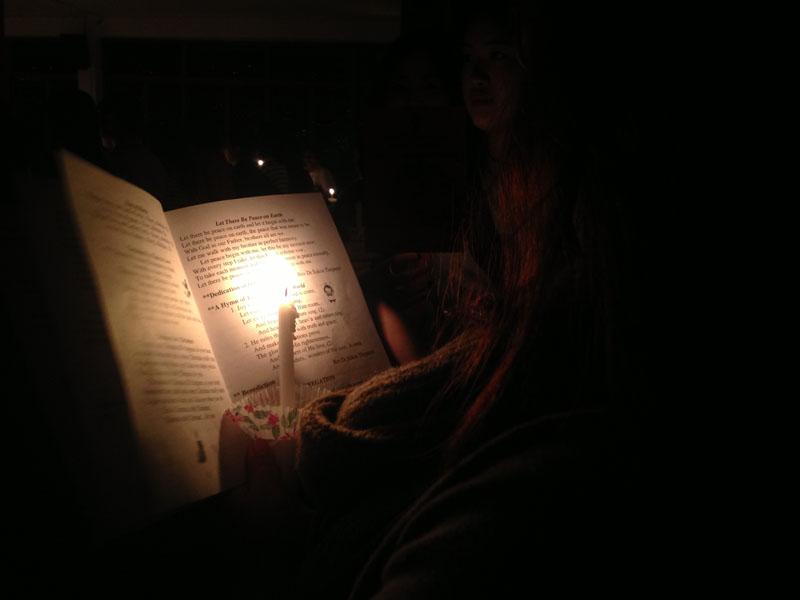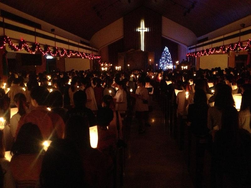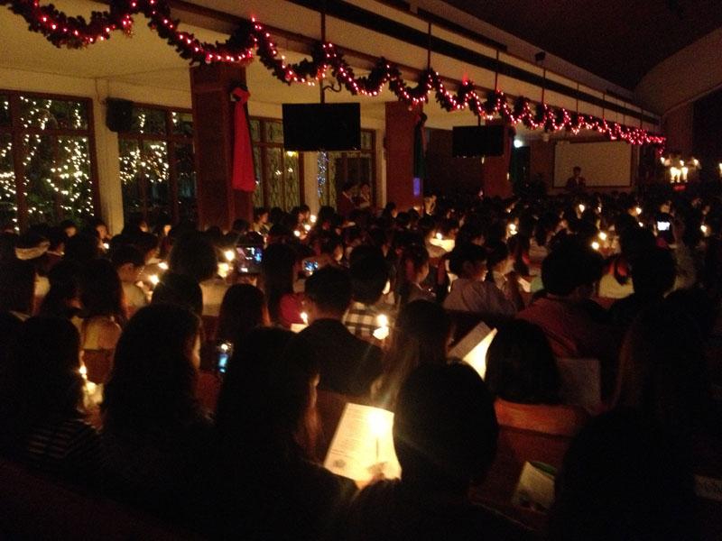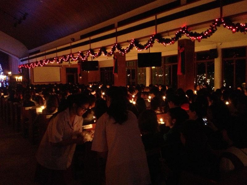 และช่วงเวลาที่สวยงามที่สุดของพิธีนี้ก็มาถึง เมื่อตัวแทนนักเรียนจะนำเทียนไปจุดให้กับต้นแถวแต่ละแถว และจุดต่อๆ กัน จากโบสถ์ที่มืดมิดทั้งหลัง ในช่วงเช้ามืดที่มีเพียงความสว่างจากแสงจันทร์ เทียนจุดต่อกันเล่มแล้วเล่มเล่า จนแสงเทียนสว่างไสวทั่วทั้งโบสถ์ พร้อมกับเสียงร้องเพลง ช่างเป็นภาพที่น่าประทับใจ