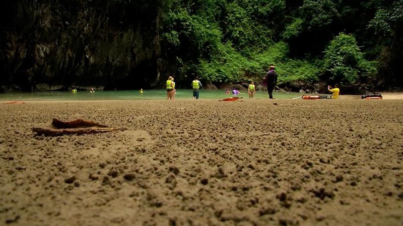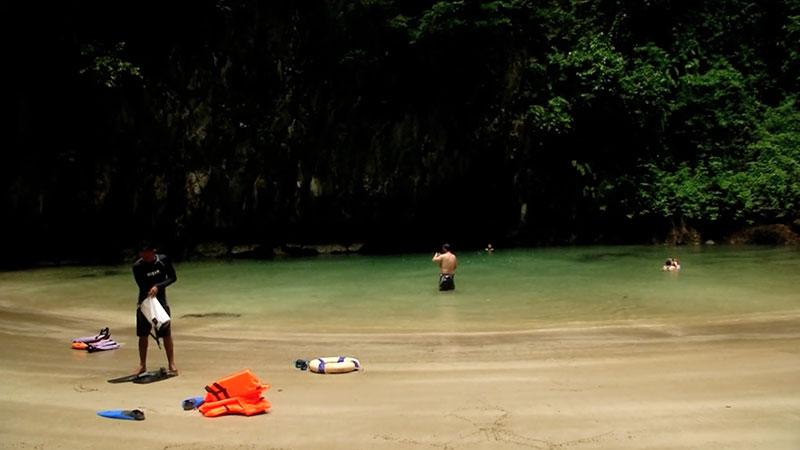 เสน่ห์และความสนุกก็คือ การลอยคอ จับคนข้างหน้าชักแถวยาวเพื่อลอดไปกับสายน้ำ ฝ่าความมืดดำของถ้ำ ระยะทาง 80 เมตร ดูเหมือนไกล ทว่าเพียงแค่อึดใจ คุณก็จะพบกับความสวยงามที่ปลายปากถ้ำ จากแสงอาทิตย์ที่สะท้อนกับผิวน้ำสีเขียวมรกตวิบวับสวยจับตา หลังจากพ้นปากถ้ำออกมาอีกด้านจะเป็นหาดทรายขาว โอบล้อมด้วยหน้าผาสูงให้นักท่องเที่ยวได้พักเติมพลัง