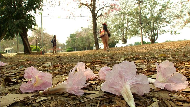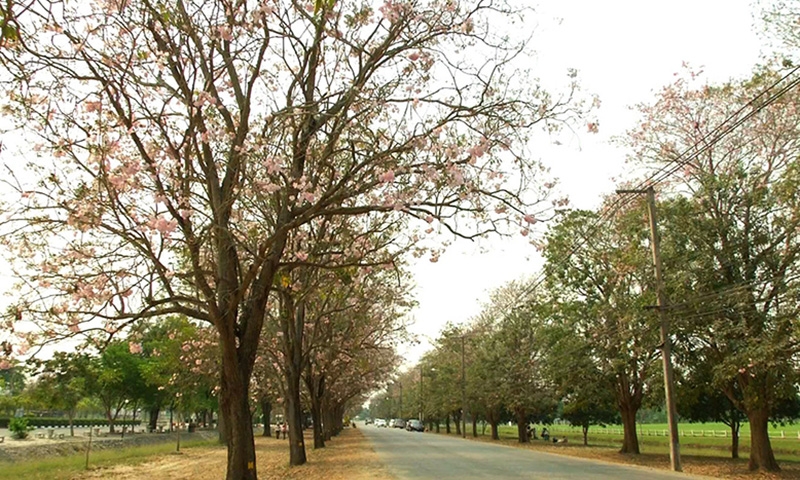 ทุกๆ ปี “ดอกชมพูพันธุ์ทิพย์” ที่มหาวิทยาลัยเกษตรศาสตร์ วิทยาเขตกำแพงแสน จะออกดอกสีชมพูบานสะพรั่งในช่วงเดือนกุมภาพันธ์ แต่ปีนี้บานทิ้งระยะมาถึงเดือนมีนาคม เพราะออกดอกช้ากว่าทุกปี ทำให้นักศึกษาได้ชมความสวยงามหลังสอบปลายภาคเสร็จพอดี