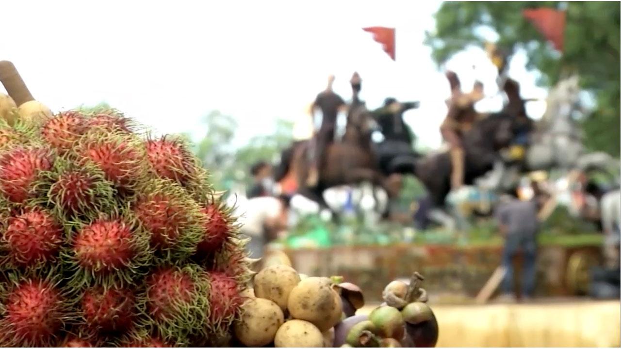 ทัพม้าของสมเด็จพระเจ้าตากสินมหาราช สวยงาม ยิ่งใหญ่ อลังการสมจริง จากฝีมือของชาวอำเภอแก่งหางแมว ที่นำทุเรียน เงาะ มังคุด และสละ ผลไม้ขึ้นชื่อของเมืองจันทบุรี ส่งตรงจากสวน เนรมิตเป็นแพผลไท้ภายใต้แนวคิดเทิดไท้องค์ราชัน