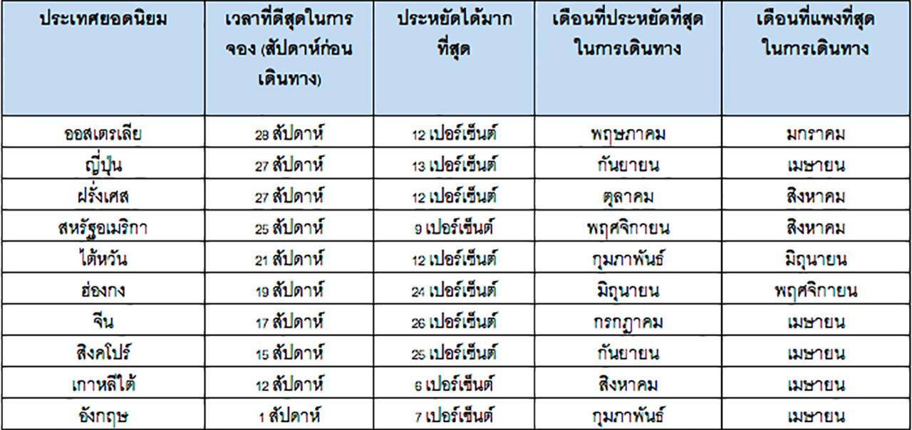 นอกจากนี้ผลสำรวจยังบอกอีกว่า เดือนพฤษภาคมเป็นเดือนที่ดีที่สุดในการเดินทาง โดยจะประหยัดไปได้ประมาณ 10 เปอร์เซ็นต์ เมื่อเทียบราคาตั๋วเครื่องบินโดยเฉลี่ย ซึ่งนับว่าเป็นข่าวดีสำหรับนักเดินทางชาวไทย เนื่องจากเป็นเดือนที่มีวันหยุดติดต่อกันหลายวัน โดยควรจะเริ่มจองตั้งแต่กลางเดือนมกราคม