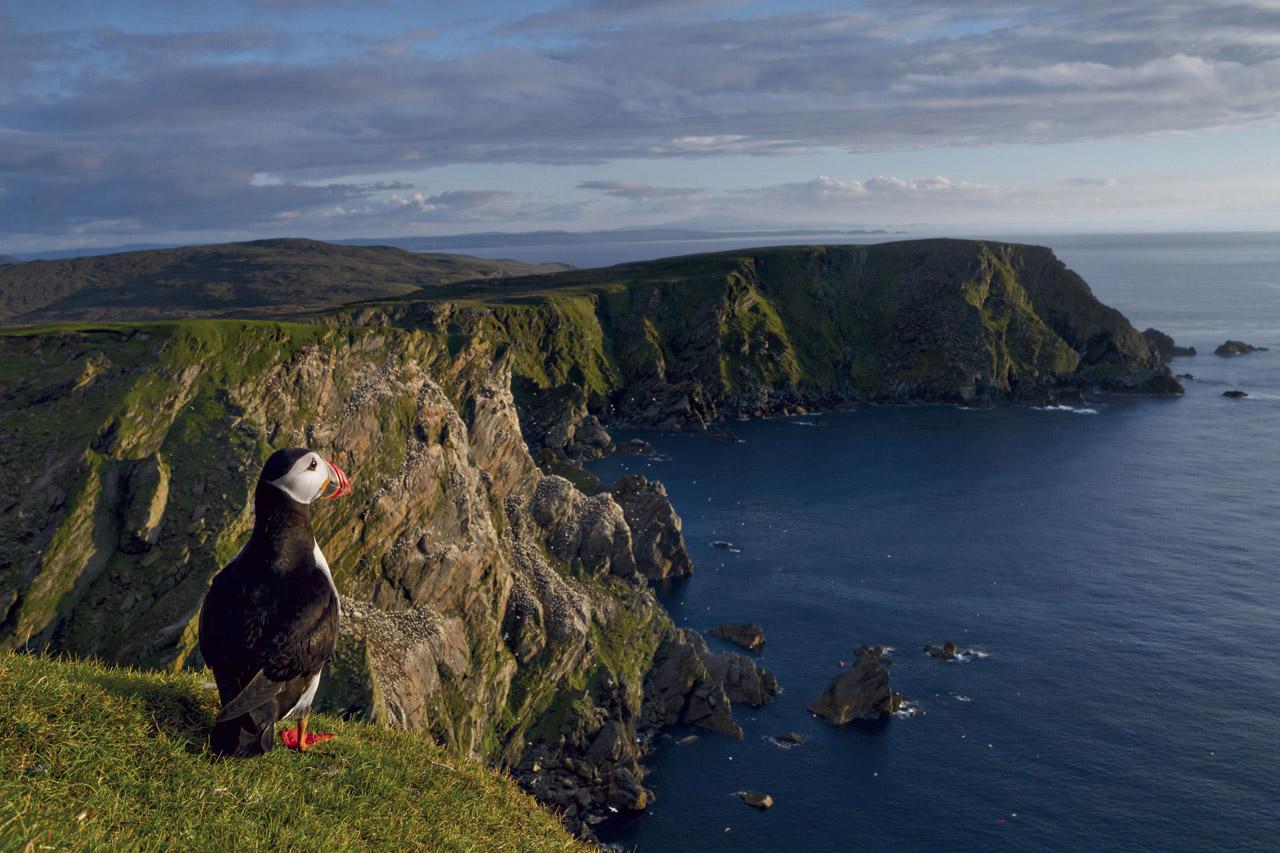 นกพัฟฟินมักรวมฝูงกันอย่างสงบเสงี่ยมเรียบร้อยแตกต่างจากคอโลนีเพนกินที่ทั้งแออัดและเอะอะโวยวาย ตามเกาะแก่งน้อยใหญ่ของอังกฤษที่ซึ่งนกพัฟฟินไม่ถูกล่ามานานนับศตวรรษ (การล่านกพัฟฟินยังเป็นเรื่องถูกกฎหมายในประเทศไอซ์แลนด์) เจ้านกตัวสูง 20 เซนติเมตรเหล่านี้อาจเชื่องอย่างน่าทึ่งและไม่เดือดเนื้อร้อนใจกับมนุษย์ผู้มาเยือน เอียน มอร์ริสัน ซึ่งพานักดูนกมายังเกาะเทรซนิชในสกอตแลนด์ตลอด 42 ปีที่ผ่านมา บอกว่า เขาอดสังเกตไม่ได้ว่า “การมีปฏิสัมพันธ์กับนกพัฟฟินทำให้ใครหลายคนมีความสุขจนผมอยากเรียกว่า ‘พัฟฟินบำบัด’ ครับ”