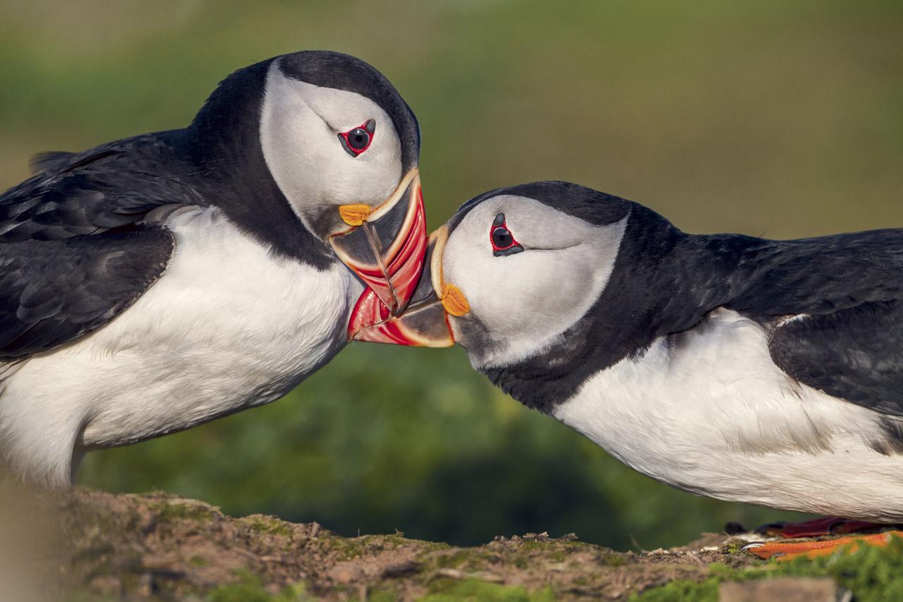 การจับคู่ผสมพันธุ์คือข้ออ้างเดียวของนกทะเลเหล่านี้ที่จะหวนคืนสู่แผ่นดิน พวกมันเริ่มสังสรรค์ เกี้ยวพาราสี จับคู่ และจิกตีกันอย่างเอาจริงเอาจัง การรวมตัวของนกพัฟฟินแอตแลนติกมีตั้งแต่ไม่กี่ร้อยคู่ในรัฐเมนไปจนถึงนับหมื่นคู่ในประเทศไอซ์แลนด์ เกาะแก่งน้อยใหญ่ของอังกฤษซึ่งเป็นสถานที่ในการถ่ายภาพของแดนนี กรีน นั้น ดึงดูดนกพัฟฟินแอตแลนติกราวร้อยละสิบจากประชากรที่คาดว่ามีอยู่ประมาณ 20 ล้านตัว (ไม่มีใครรู้จำนวนที่แน่ชัด)