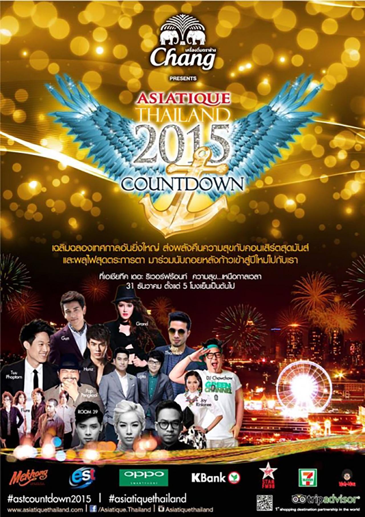 ร่วมนับถอยหลังเข้าสู่ศักราชใหม่ไปพร้อมกัน ณ ลาน Asiatique ถนนเจริญกรุง ซอย 72-76 คอมมูนิตี้มอลล์ขนาดใหญ่ ที่ตอบโจทย์ทุกไลฟ์สไตล์ ทั้งสถาปัตยกรรม การจำลองบรรยากาศเมืองกรุงสมัยก่อน และตึกสมัยใหม่บรรจบกันได้อย่างลงตัว โดยงานนี้ได้สปอนเซอร์สนับสนุนใจดี 'เครื่องดื่มตราช้าง' มาเนรมิตการจัดงานเคาต์ดาวน์ระดับประเทศ ส่งมอบความสุขด้วยปาร์ตี้คอนเสิร์ตสุดมัน อาทิ กัน-ฮั่น-แกรนด์ จาก The Star, ตู่ ภพธร, ลิปตา, ฟลัวร์ และ รูม 39 พร้อมตื่นตาไปกับพลุดอกไม้ไฟสุดตระการตาแห่งปี ที่จุดขึ้นกลางแม่น้ำเจ้าพระยา!