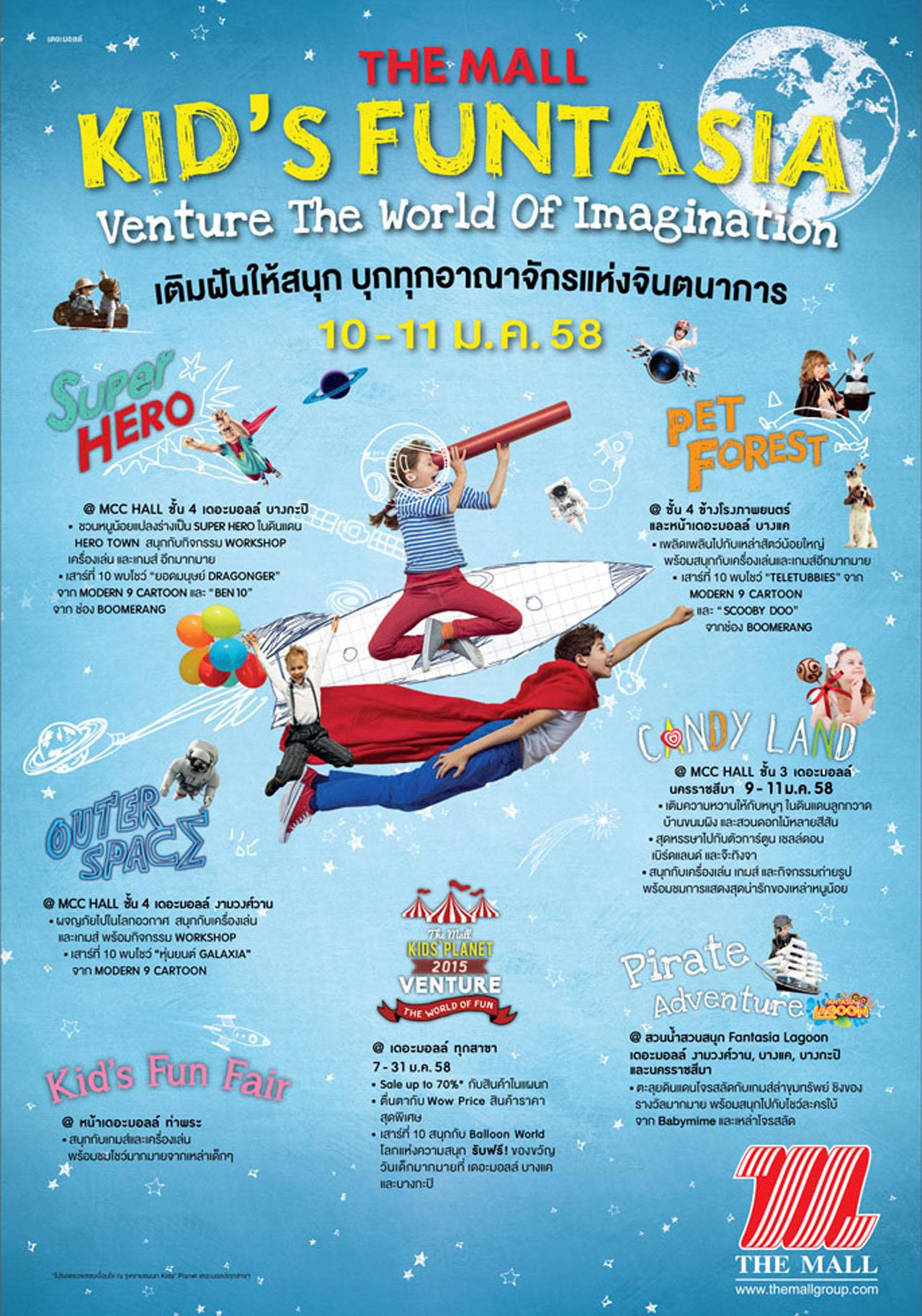 บริษัท เดอะมอลล์ กรุ๊ป จำกัด จัดงาน The Mall Kid's Funtasia ภายใต้คอนเซปต์ "Venture The World of Imagination" เติมฝันให้สนุก บุกทุกอาณาจักรแห่งจินตนาการ เนรมิตโลกแห่งจินตนาการของเด็กๆ ให้ออกมาเป็นธีมแต่ละสาขาที่แตกต่างกันอย่าง "Outer Space", "Pet Forest", "Super Hero", "Kid's Fun Fair", และ "Candy Land" พร้อมกิจกรรมสุดสร้างสรรค์ให้ร่วมสนุกอีกมากมาย โดยงานจะจัดขึ้นระหว่างวันที่ 10 - 11 ม.ค.58 ที่ ศูนย์การค้าเดอะมอลล์ สาขางามวงศ์วาน, บางแค, บางกะปิ, ท่าพระ, และนครราชสีมา