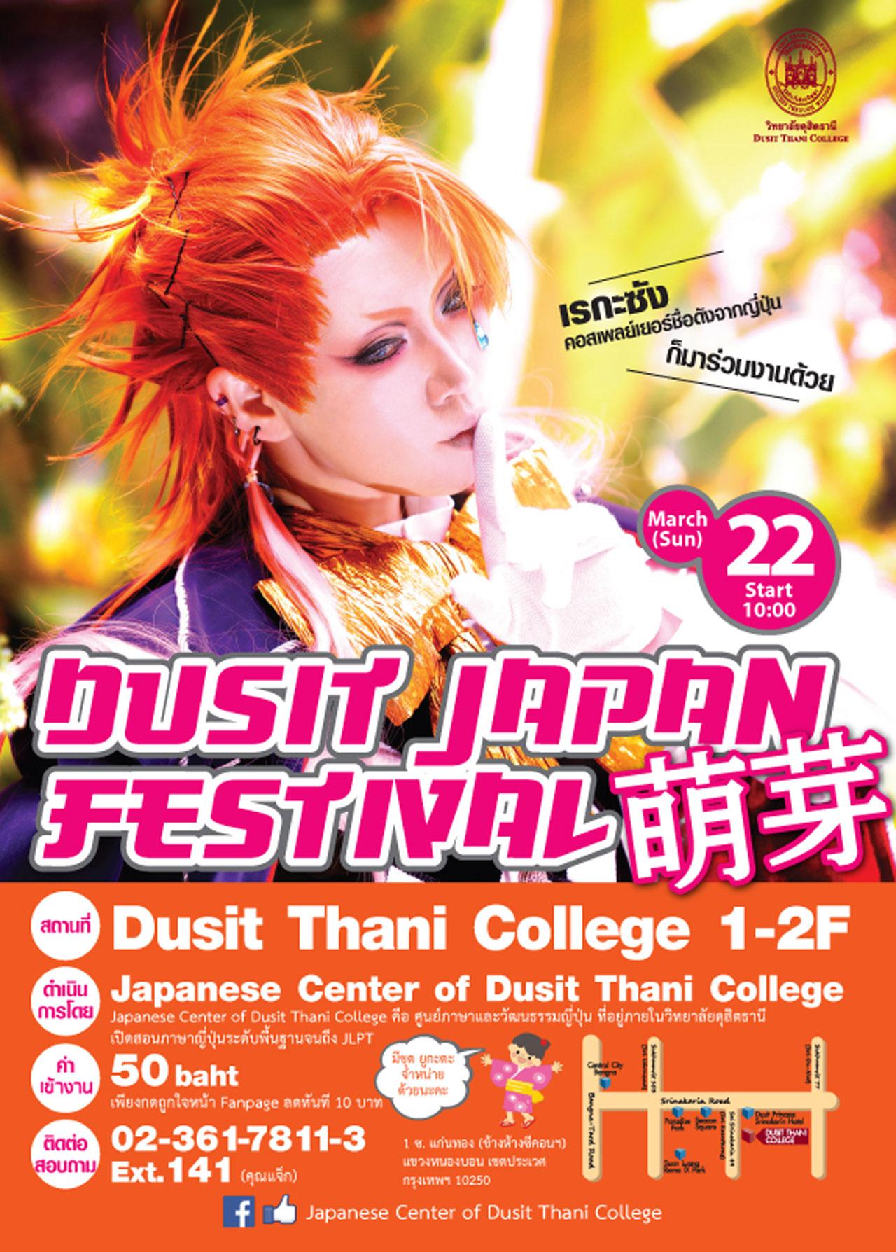 วันที่ 22 มีนาคม 2558 ชวนร่วมกิจกรรม "ดุสิต เจแปน เฟสติวัล" ณ วิทยาลัยดุสิตธานี กรุงเทพฯ ภายในงานพบกับการประกวดการแต่งกายแบบ Cosplay ประชันความเก๋ไก๋ ชมสุดยอดการแสดงจากประเทศญี่ปุ่น ถ่ายภาพชุดยูกะตะ เรียนรู้วิธีการใส่ชุดยูกะตะ และพิธีการชงชาแบบญี่ปุ่น พร้อมช็อปและชิมไปกับบูธจำหน่ายสินค้าอีกมากมาย สอบถามเพิ่มเติม โทร. 0 2361 7811-3 ต่อ 141-143, 204 หรือ www.facebook.com/japanesecenterdtc