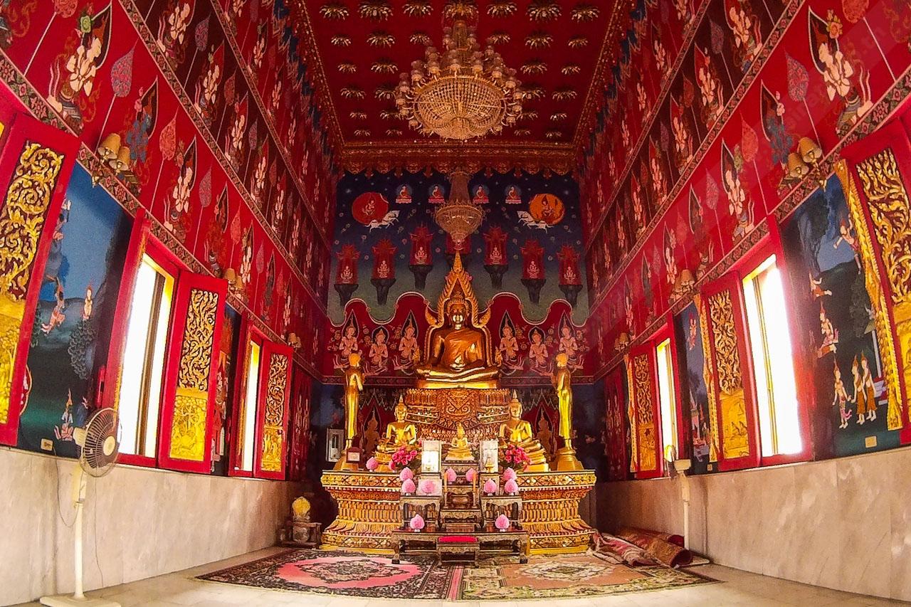 ด้านในโบสถ์ก็สวยงามเช่นกัน มีพระประธานหล่อทองประดิษฐานให้ไหว้สักการะบูชา และรอบๆ ก็มีภาพจิตรกรรมฝาผนังที่สวยงามน่าชม ใครอยากไปเวียนเทียนพร้อมชมอุโบสถสวยๆ แนะนำวัดนี้เลย