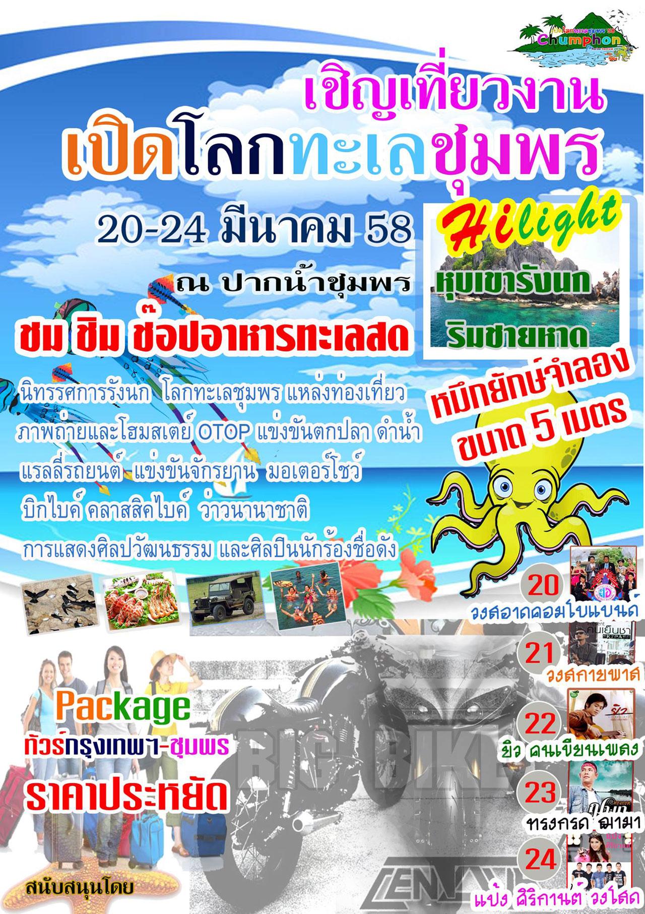 วันที่ 20-24 มีนาคม 2558 จ.ชุมพร ชวนร่วมงาน "เปิดโลกทะเลชุมพร ครั้งที่ 25 ประจำปี 2558" ณ ชายทะเลปากน้ำชุมพร ต.ปากน้ำ อ.เมืองฯ จ.ชุมพร ภายในงานพบกับ นิทรรศการโลกทะเล กิจกรรมถ่ายภาพสถานที่ท่องเที่ยวในจังหวัดชุมพร นิทรรศการแสดงภาพถ่าย เทศกาลอาหารทะเลสด กิจกรรมดำน้ำเก็บขยะ การปล่อยพันธุ์สัตว์น้ำหายาก ตลาดย้อนยุคจำหน่ายผลิตภัณฑ์โอทอป แพ็กเกจทัวร์ราคาพิเศษเทศกาลว่าวนานาชาติ กิจกรรมหุบเขารังนก การแสดงวัฒนธรรมพื้นบ้าน การแข่งขันกีฬาตกปลา วิ่งขึ้นเขามัทรี จักรยานแรลลี่ขึ้นเขามัทรี และฟุตบอลชายหาด