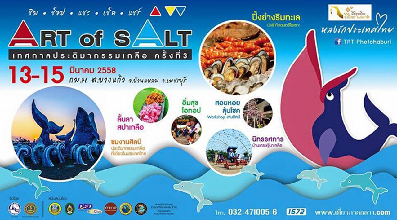 วันที่ 13–15 มีนาคม 2558 จ.เพชรบุรี ชวนเที่ยวงาน "Art of Salt ครั้งที่ 3" ณ กม.41 ถนน สส.2021 หมู่บ้านบางแก้ว ต.บางแก้ว อ.บ้านแหลม จ.เพชรบุรี ตั้งแต่เวลา 16.00-23.00 น. ภายในงานพบกับประติมากรรมเกลือแห่งแรกของประเทศไทย รูปวาฬบรูด้า และฝูงปลาโลมา ท่ามกลางบรรยากาศริมฝั่งทะเลอ่าวไทย ชมพิพิธภัณฑ์พื้นบ้านเกลือ ผ่อนคลายความเมื่อยล้าที่ Salt Spa เรียนรู้นาเกลือจำลอง จิบเครื่องดื่มเย็นๆ ฟังดนตรีริมหาดที่ Salt Bar อิ่มอร่อยกับอาหารทะเลปิ้งย่างและอาหารพื้นถิ่นบ้านแหลม เช่น หอยเสียบคั่วราดน้ำตาลโตนด ขนมจีนทอดมันผักชะคราม หอยทอดบ้านแหลม ปูดุ๊กดิ๊ก พร้อมช็อปปิ้งของฝากกับตลาดหมู่บ้านชาวประมง ร่วมกิจกรรมสอยหอยบ้านแหลม