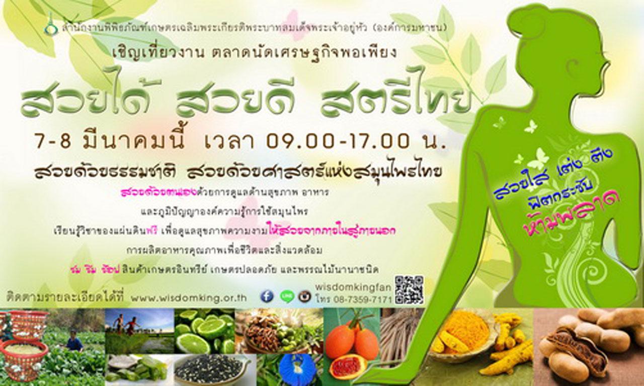 วันที่ 7-8 มีนาคม 2558 จ.ปทุมธานี ชวนเที่ยวงานตลาดนัดเศรษฐกิจพอเพียง "สวยได้ สวยดี สตรีไทย" ณ พิพิธภัณฑ์การเกษตรเฉลิมพระเกียรติพระบาทสมเด็จพระเจ้าอยู่หัว ตรงข้ามโรงพยาบาลการุญเวช ปทุมธานี ถนนพหลโยธิน จ.ปทุมธานี ภายในงานพบกับนิทรรศการสมุนไพรเพื่อความงาม และการดูแลสุขภาพในชีวิตประจำวัน ร่วมอบรมหลักสูตรเพื่อดูแลสุขภาพความงามฟรี 8 หลักสูตร ชมมหัศจรรย์พันธุ์พืชสมุนไพรกระชับความงามและพืชป่ารักษาโรค