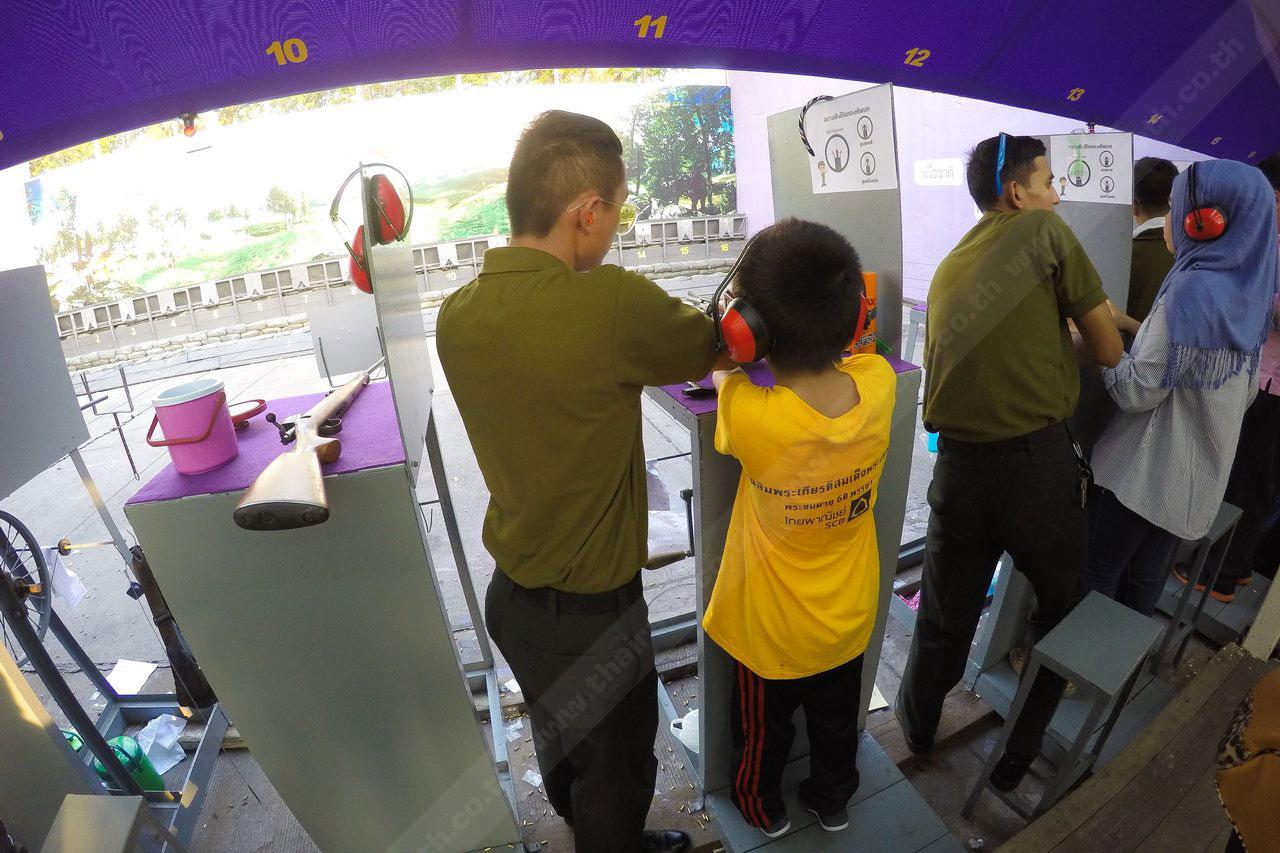 ใครอยากลองยิงปืนของจริง มาทางนี้ เพราะทางกองทัพไทย 4 เหล่าได้จัดให้มีการสอนยิงปืนจริงกันสดๆ ในบูธของทหารอากาศ ทหารบก ทหารเรือ และตำรวจ โดยบูธจะตั้งอยู่บริเวณใกล้ๆ กับพระที่นั่งอนันตสมาคม ขั้นตอนการร่วมสนุกก็ง่ายๆ เพียงแค่คุณร่วมบริจาคค่าชุดปืนคนละ 50 บาท จะได้กระสุน 5 นัด จากนั้นจะมีเจ้าหน้าที่คอยสอนยิงปืน และให้ลองยิงเป้ากระดาษ