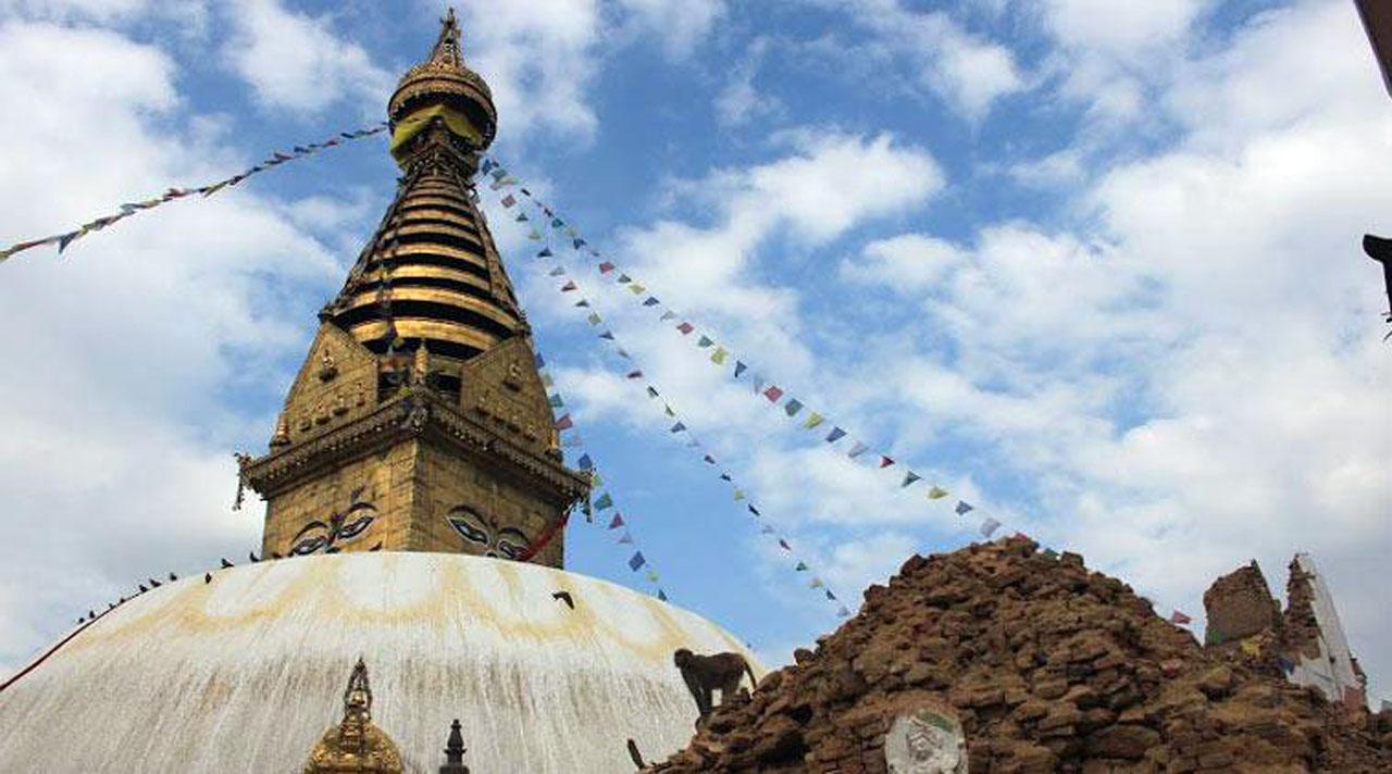 หลังจากเกิดเหตุสะเทือนใจคราวนี้ เจดีย์สวายัมภูนาถก็ได้รับผลกระทบเช่นกัน แม้ว่าตัวเจดีย์จะอยู่รอดปลอดภัยดี แต่อาคารและสิ่งปลูกสร้างโดยรอบพังทลายลงมาเกือบทั้งหมด แทบไม่เหลือเค้าโครงเดิม