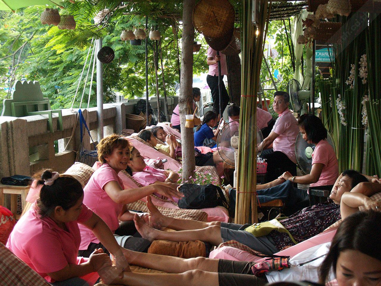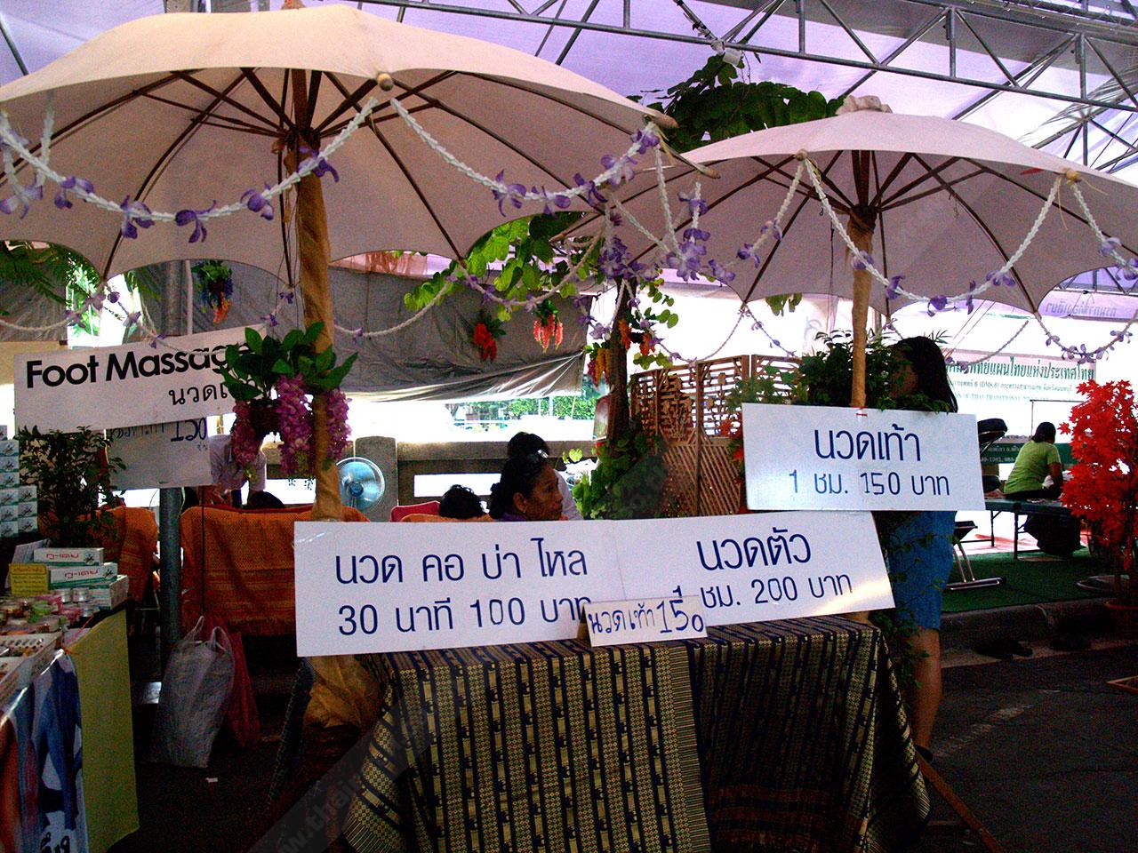 บูธบริการนวดแผนไทย ถือเป็นซิกเนเจอร์ของงานนี้เลยก็ว่าได้ เพราะตั้งแต่เดินเข้างานมา จะเห็นซุ้มรับนวดแผนไทยมาตั้งแต่ต้นๆ ตลาด มีอยู่หลายซุ้มด้วยกัน มาจากหลากหลายสถาบันชั้นครู ได้แก่ นวดแผนไทยจากวัดโพธิ์ และ นวดแผนไทยจากโรงเรียนสอนนวดไทยและการประคบสมุนไพร ดอยน้ำซับ จ.เชียงราย เป็นต้น