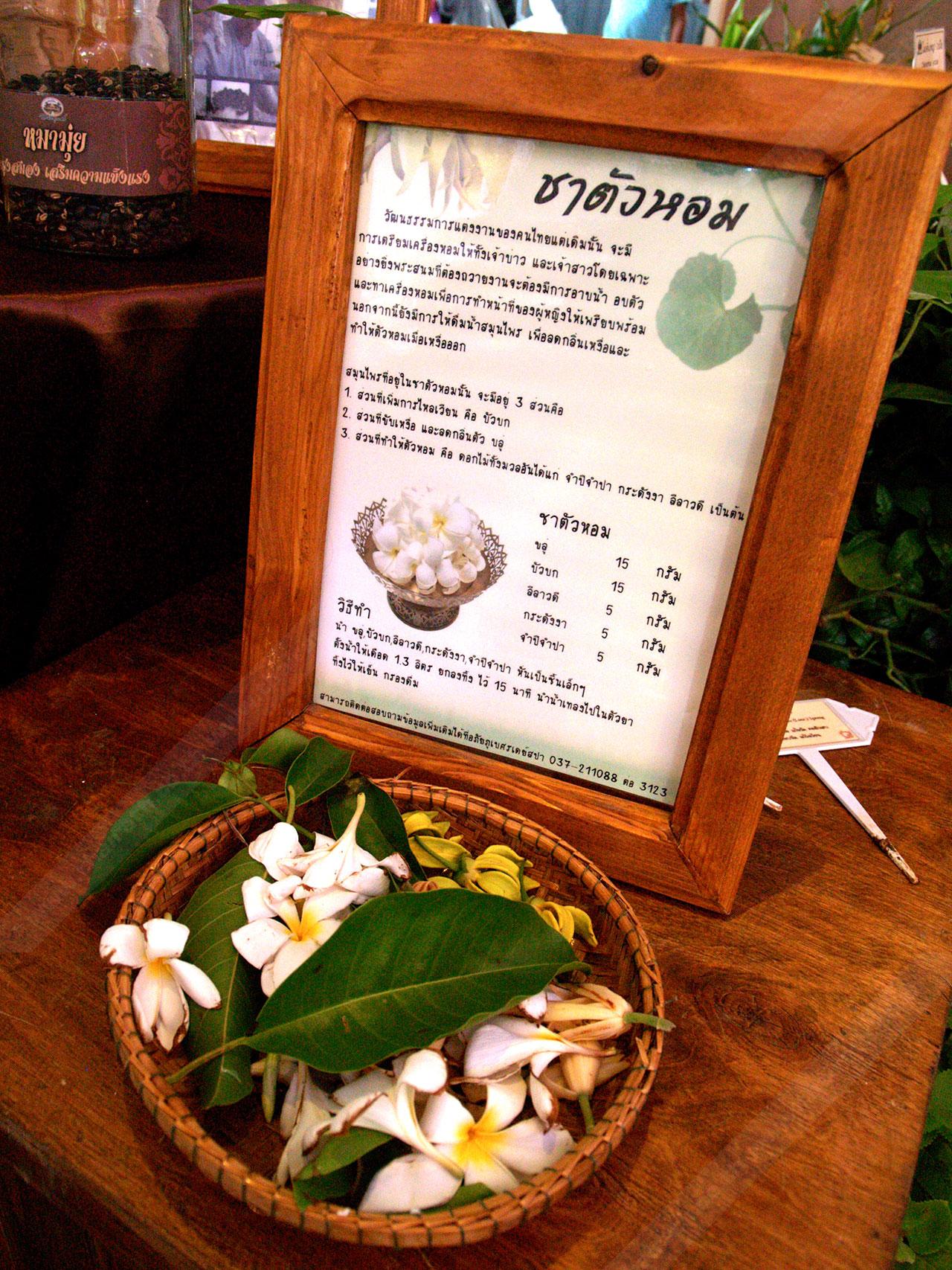 เริ่มกันที่ไฮไลต์ของงานนี้ นั่นคือ ชาดอกไม้ชาววัง หรือ ชาตัวหอม เป็นชาที่คนสมัยก่อนปรุงให้เจ้าบ่าวและเจ้าสาวดื่มก่อนเข้าพิธีวิวาห์ เชื่อกันว่าเป็นเคล็ดลับแห่งความสุขของคู่บ่าวสาว