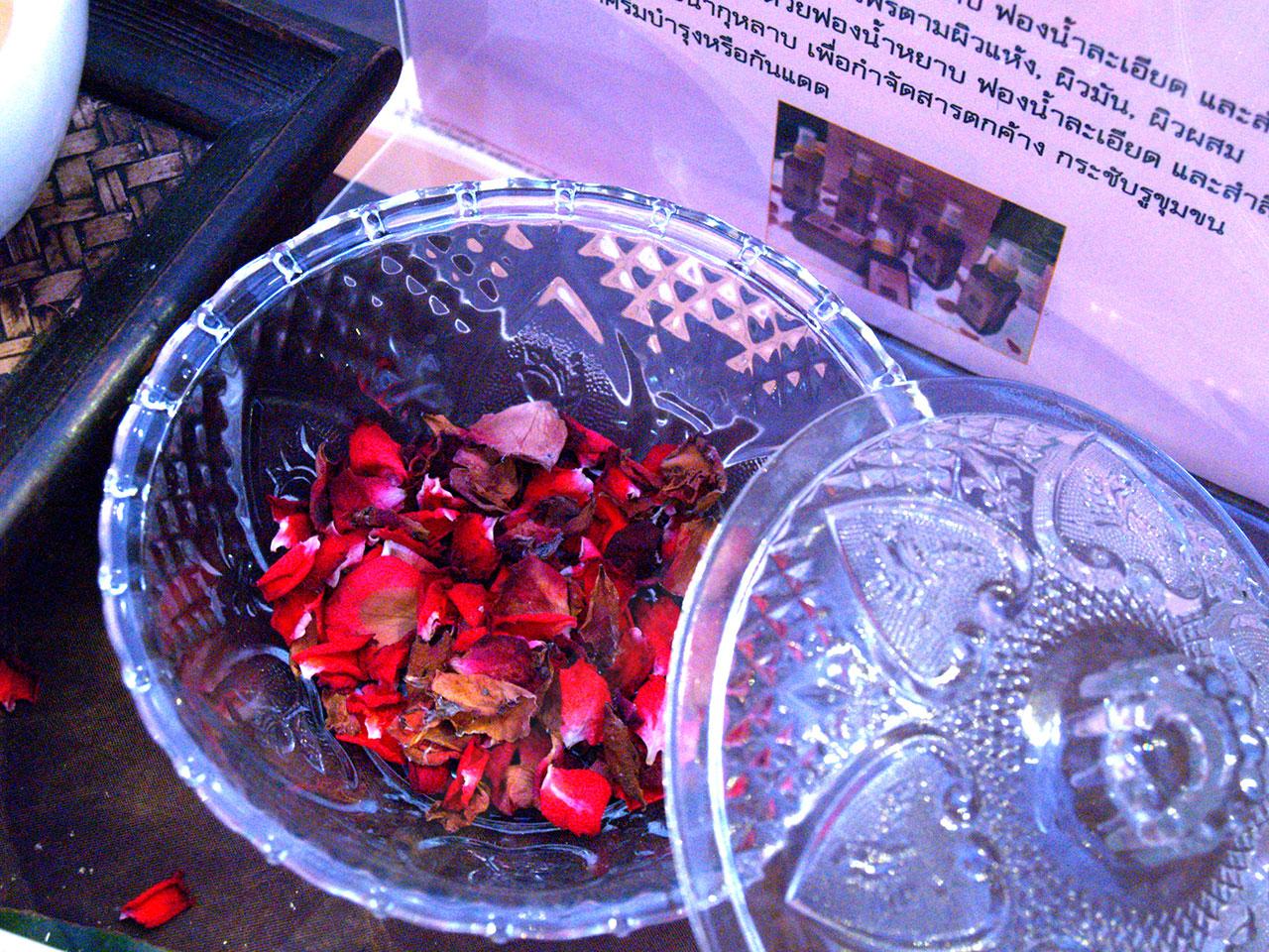 เดินมาอีกหน่อย ช่วงกลางๆ ของงาน ก็บังเอิญไปพบสิ่งน่าสนใจเข้าอีกแล้ว นั่นคือ น้ำกุหลาบ เป็นผลิตภัณฑ์น้ำแร่เช็ดบำรุงผิวหน้า โดยใช้ส่วนประกอบหลักเป็นดอกกุหลาบมอญปลอดสารพิษ โดยที่บูธก็มีจำหน่ายแบบสำเร็จรูปด้วย แต่ถ้าใครอยากลองทำเองก็ทำได้ไม่ยาก เพราะมีวิธีทำแนะนำ โดยเตรียมกุหลาบมอญ 20 ดอก และน้ำสะอาด 1 ถ้วยตวง