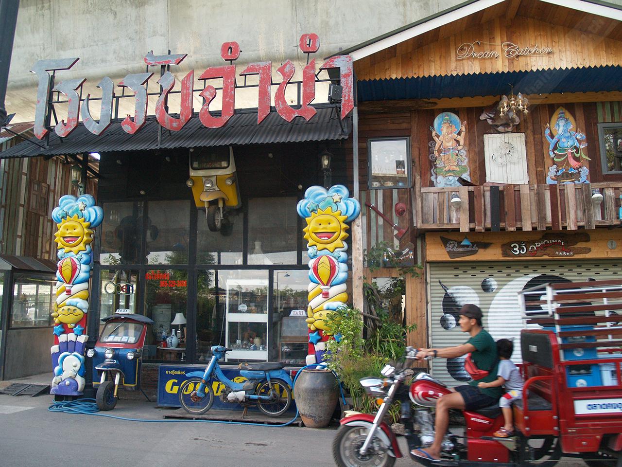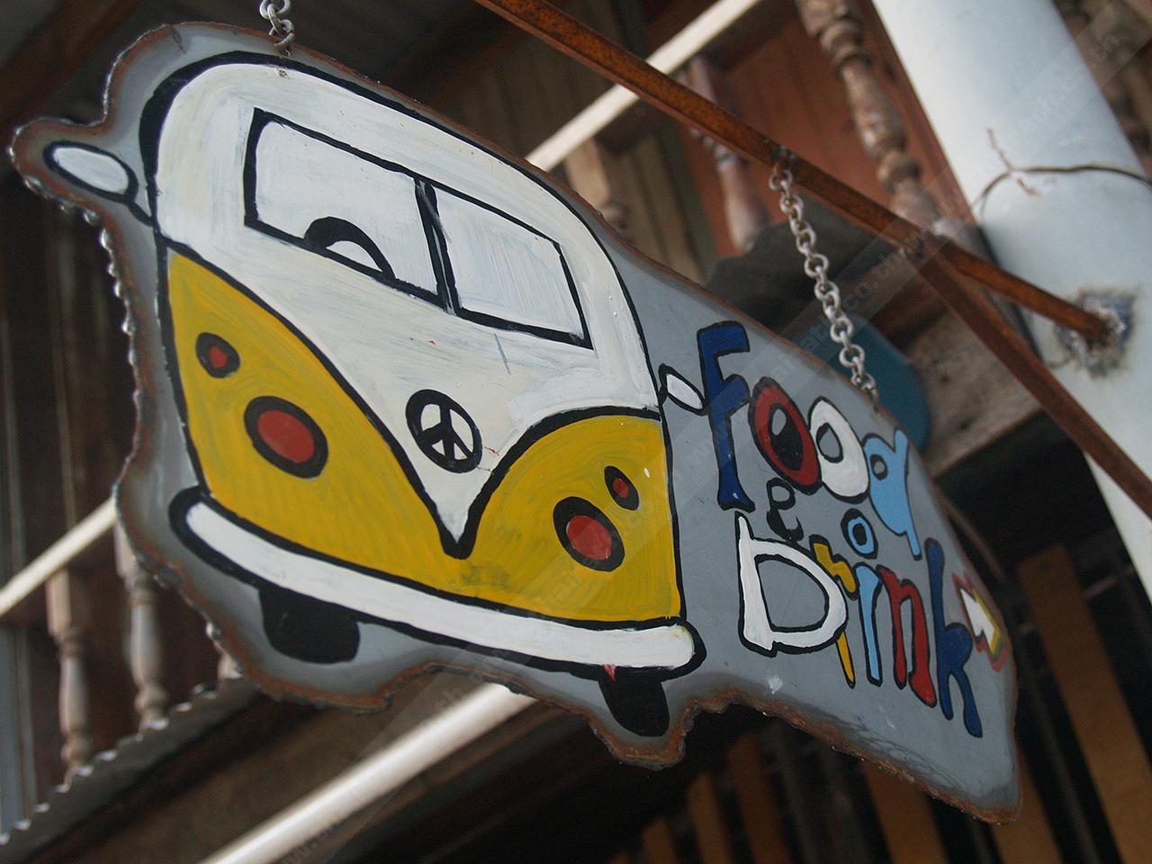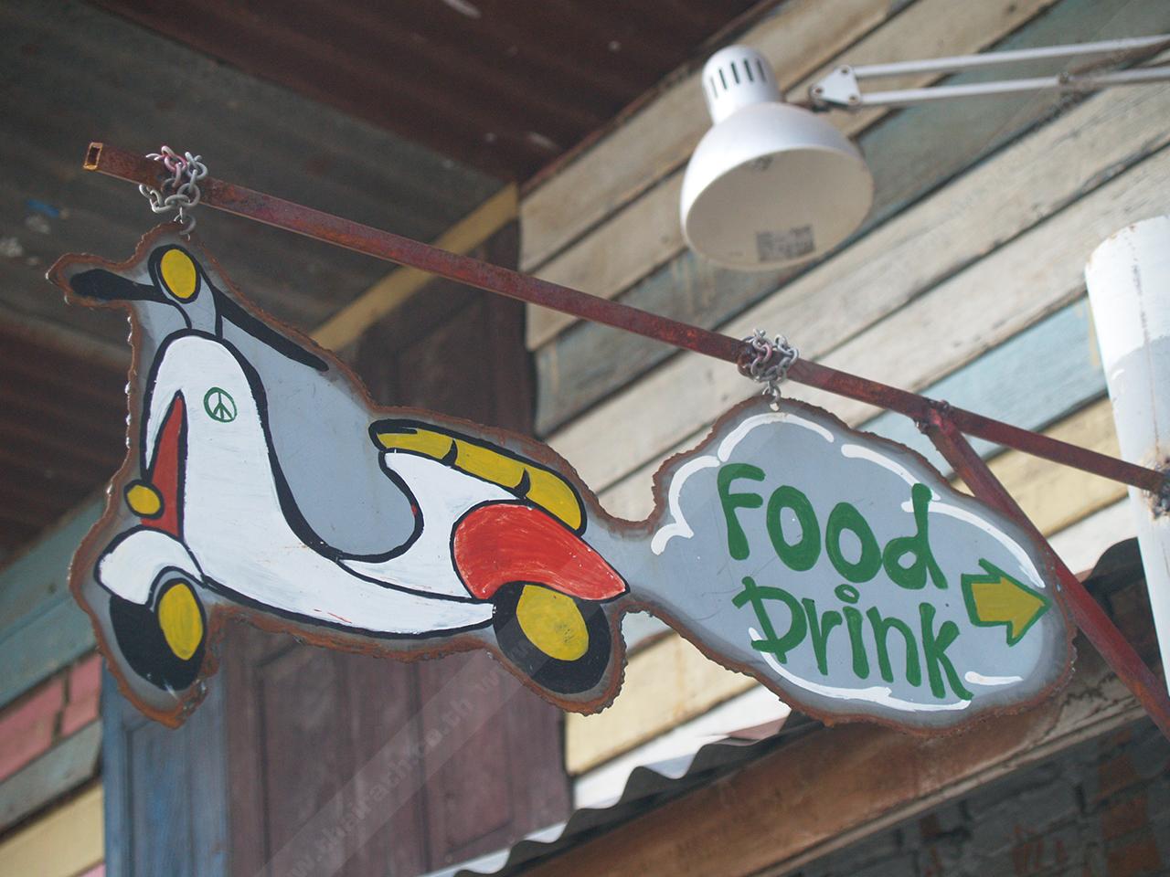อีกอย่างหนึ่งที่น่าสนใจและเท่ดี ก็คือ ป้ายตามร้านค้าต่างๆ เขาจะมีการออกแบบเอง ทำเป็นรูปร่างต่างๆ ที่บ่งบอกว่าร้านนี้ขายอะไร เช่น ทำเป็นรูปไข่ดาว รูปรถ รูปต้นมะพร้าว เป็นต้น โดยจะทำเป็นป้ายเหล็กมาแขวนหน้าร้าน