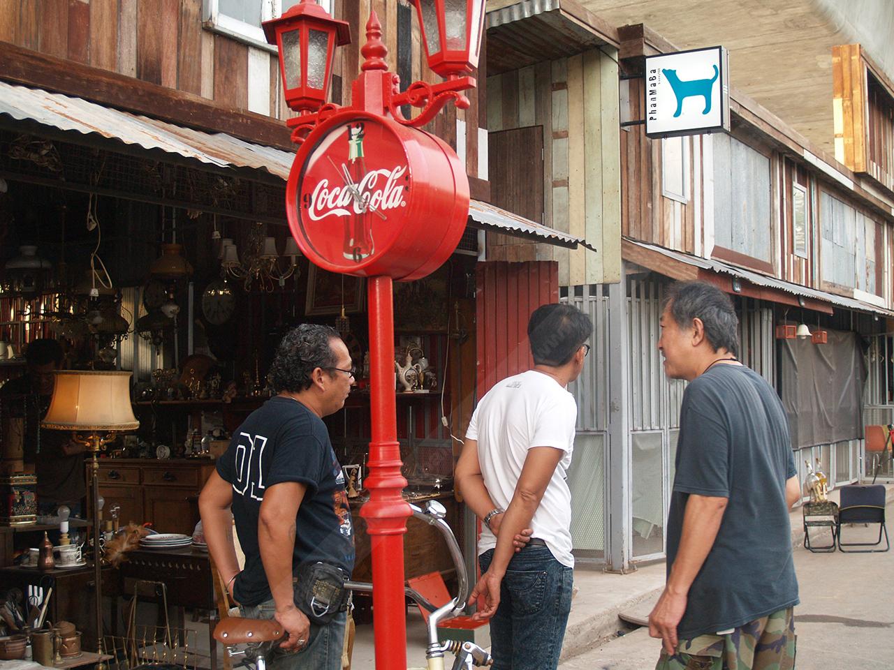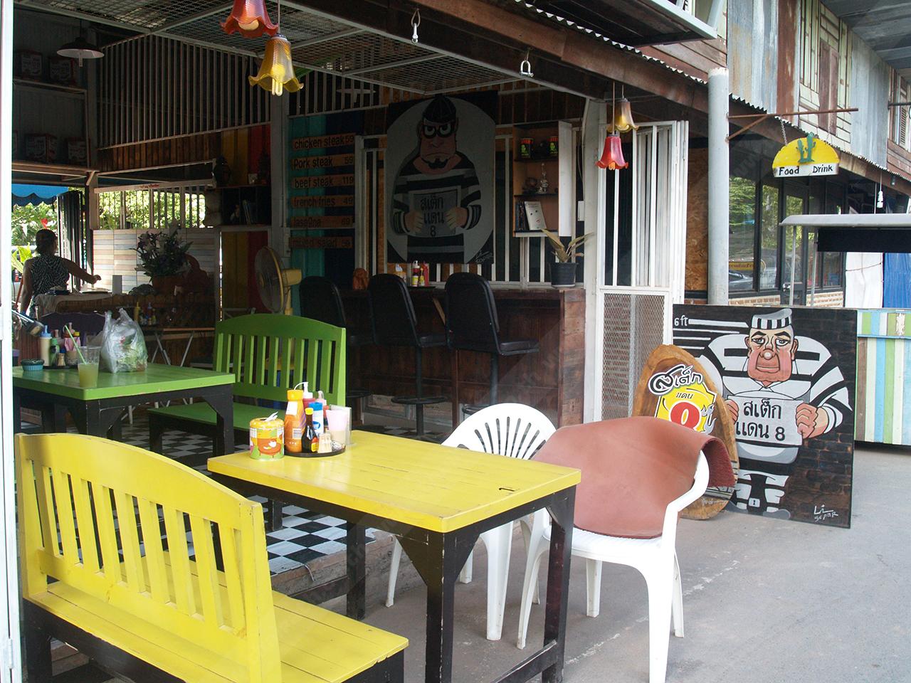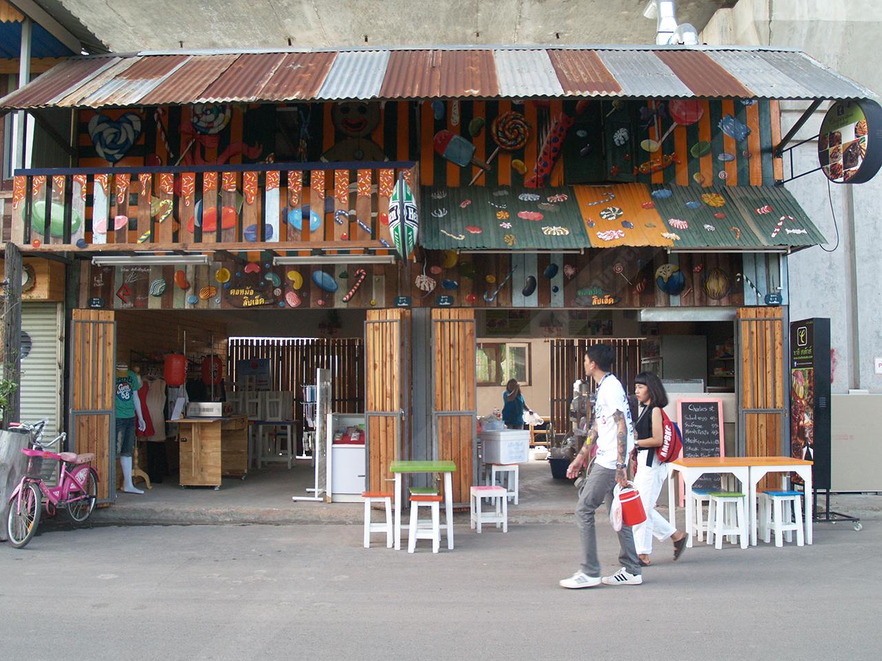 อีกอย่างหนึ่งที่น่าสนใจและเท่ดี ก็คือ ป้ายตามร้านค้าต่างๆ เขาจะมีการออกแบบเอง ทำเป็นรูปร่างต่างๆ ที่บ่งบอกว่าร้านนี้ขายอะไร เช่น ทำเป็นรูปไข่ดาว รูปรถ รูปต้นมะพร้าว เป็นต้น โดยจะทำเป็นป้ายเหล็กมาแขวนหน้าร้าน