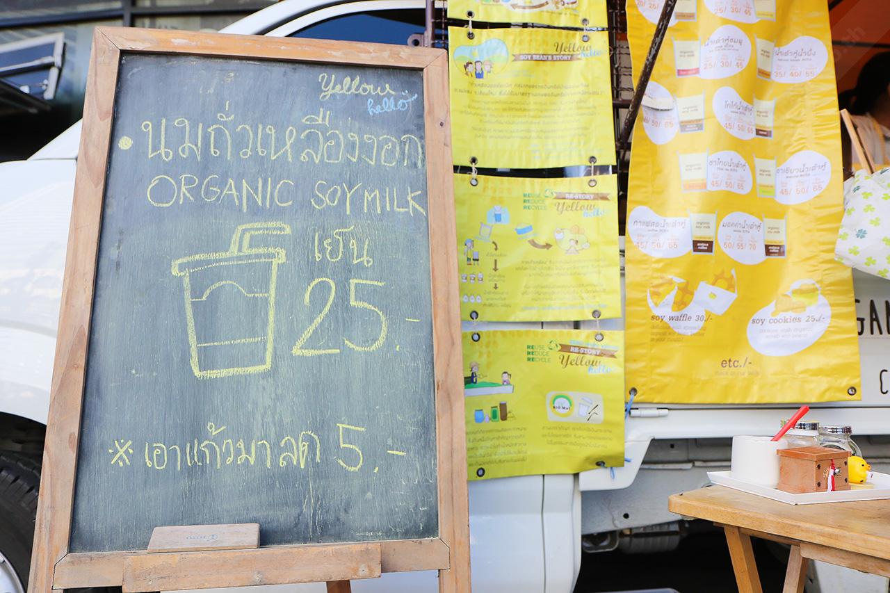 อีกร้านที่โดดเด่น คือ ร้าน Yellow Hello เป็นเจ้าเดียวในตลาดที่ขายอาหารออแกนิก โดยเสิร์ฟเมนูน้ำเต้าหู้ออแกนิกที่ไม่เหมือนใคร สนนราคาแก้วละ 25 บาท เท่านั้น รสชาตินุ่มละมุน ไม่หวานมาก เหมาะกับคนรักสุขภาพสุดๆ นอกจากนี้ยังมีขนมหน้าตาน่ารักรสชาติอร่อย เช่น คุกกี้ วาฟเฟิลไส้ถั่วเหลือออแกนิก อบใหม่ร้อนๆ เค้กโรล และบราวนี่ ซึ่งบราวนี่ของร้านนี้จะไม่มีกลูเตน (คนที่แพ้กลูเตนสามารถทานได้) เพราะใช้แป้งข้าวหอมมะลิอินทรีย์แทนแป้งสาลี รับรองอร่อยได้สุขภาพดี