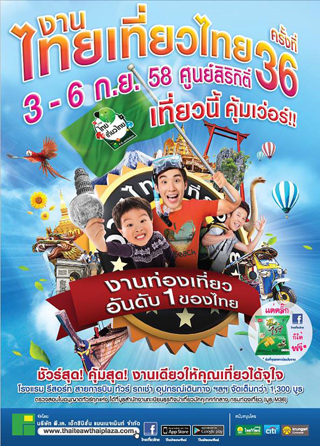 วันที่ 3-6 ก.ย. 2558 ชวนไปเที่ยวช็อปแพ็กเกจท่องเที่ยวราคาสุดคุ้มในงาน "ไทยเที่ยวไทย ครั้งที่ 36" ณ ศูนย์ประชุมแห่งชาติสิริกิติ์ โดยไฮไลต์อยู่ที่ บูธเลขที่ G225 โซน C ชั้น 1 คิดส์ซาเนีย กรุงเทพฯ จะมามอบแพ็กเกจสุดคุ้ม ซื้อ 1 แถม 1 และจำหน่ายบัตรเข้าเมืองในราคาลดพิเศษที่สุดถึง 50% เฉพาะในงานนี้เท่านั้น