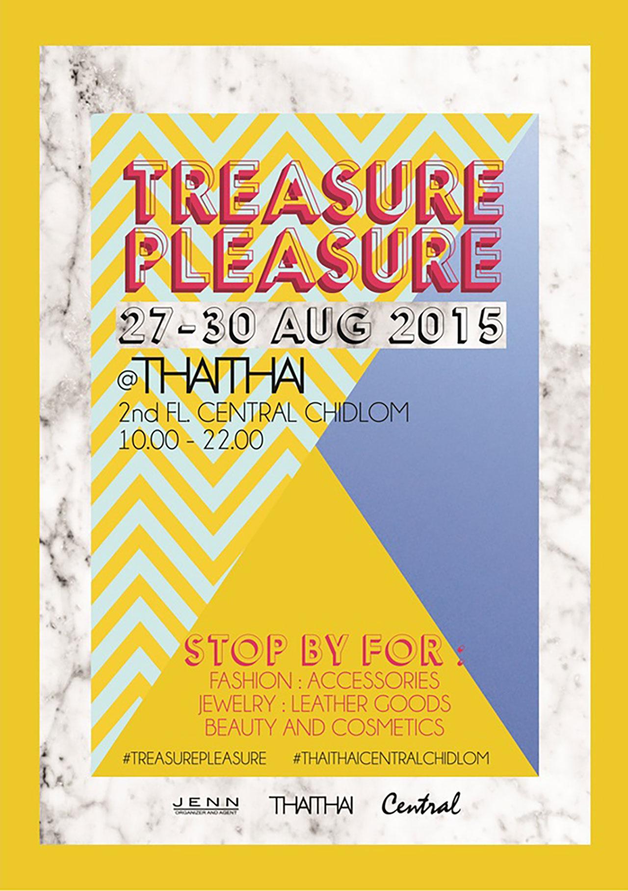 วันนี้-30 ส.ค. 2558 เวลา 10:00-22.00 น. ชวนไปช็อป ชิม ชิล ในงาน "TREASURE PLEASURE" ณ โซน “THAITHAI” (ไทยไทย) ชั้น 2 ห้างเซ็นทรัลชิดลม ภายในงานพบกับสินค้าสุดเก๋ เท่ ชิค หลากหลายสไตล์ จากกว่า 30 ร้านดังใน Instagram เช่น SIWA ARPORN ผ้าพันคอและเสื้อผ้าไม่เหมือนใคร, BESTRY SHOP เครื่องประดับวินเทจสุดเก๋ พร้อมกระเป๋านิตติ้งและซอฟท์เคส, MA CHANDELLE เครื่องหอมโฮมเมด วัตถุดิบคุณภาพสูง และ MIKIWU เคสมือถือและรองเท้าที่กำลังมาแรง ฯลฯ ภายในงานยังเติมสีสันความสุขด้วยเพลงเพราะๆ จากดีเจหนุ่มสุดหล่อตลอดทั้งวัน