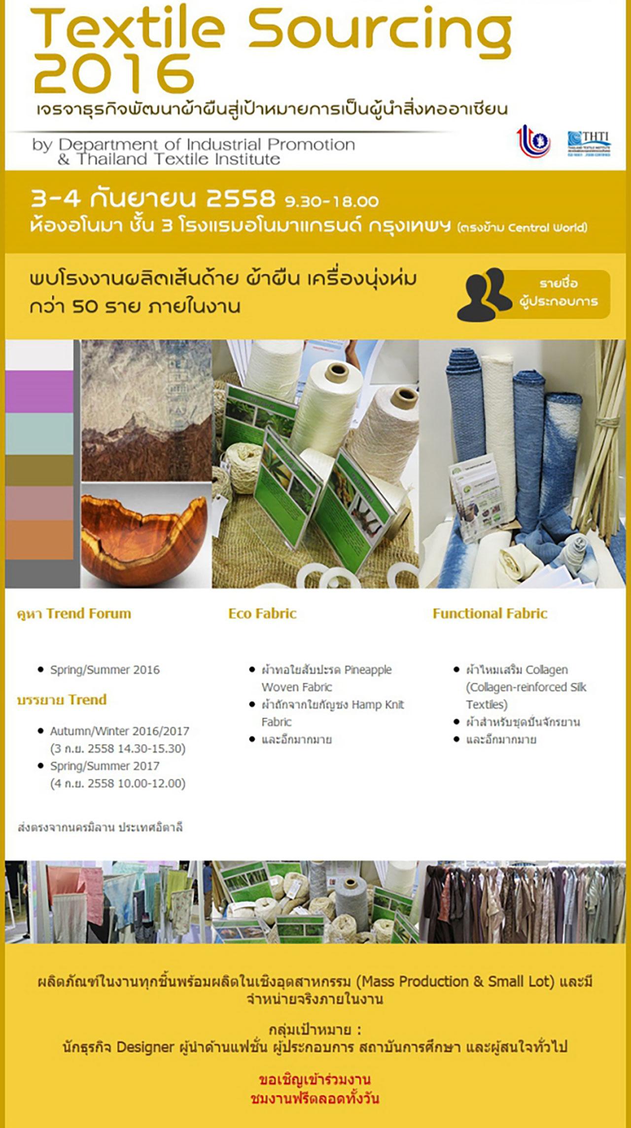 วันที่ 3-4 ก.ย. 2558 เวลา 09.30-18.00 น. ชวนเที่ยวชมงาน "Textile Sourcing 2016" ณ ห้องอโนมา 2-3 ชั้น 3 โรงแรมอโนมาแกรนด์ (ตรงข้ามเซ็นทรัลเวิลด์) กรุงเทพฯ ภายในงานพบกับกิจกรรมต่างๆ เช่น เลือกช็อปเส้นด้าย ผ้าผืน และเครื่องนุ่งห่มจากผู้ผลิตและจำหน่ายชั้นนำ ผลิตภัณฑ์ผ้าผืนเสริมคอลลาเจน ผ้าสำหรับชุดปั่นจักรยาน ผ้าจัดการความชื้น ฯลฯ พร้อมอัพเดตเทรนด์ผ้าผืนให้ก้าวทันเทรนด์โลก Autumn/Winter 2016/2017 งานนี้เข้าร่วมฟรี สอบถามเพิ่มเติม โทร. 0 2713 5492-9 ต่อ 402 (คุณสุดา) หรือ www.thaitextile.org