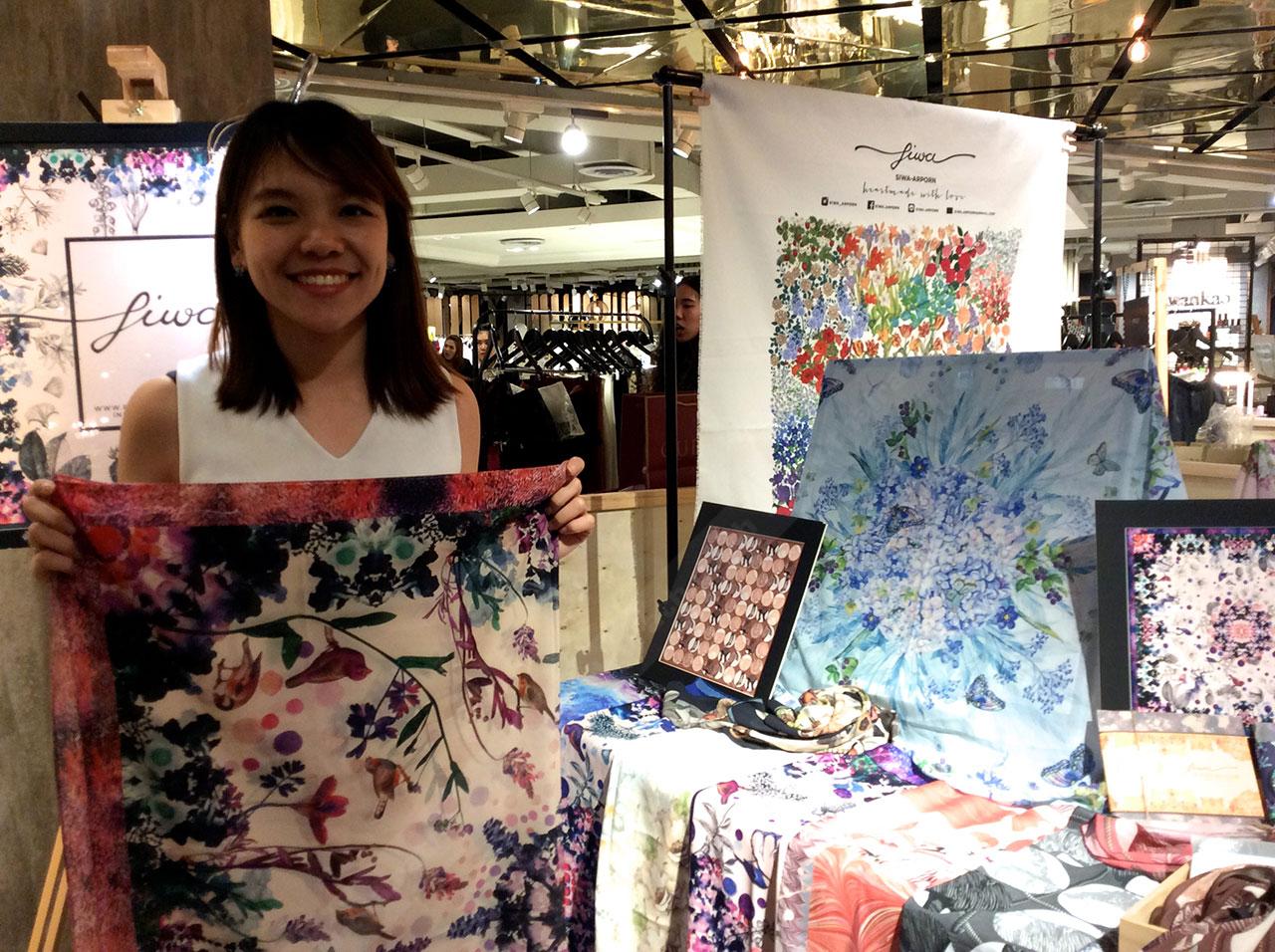 ร้านศิวา อาภรณ์ เป็นร้านขายผ้าพันคอพิมพ์ลายที่ออกแบบเอง มีให้เลือกหลายลวดลาย ส่วนใหญ่ได้แรงบันดาลใจมาจากธรรมชาติ เช่น ดอกไม้ที่เอาไปทับในหนังสือ แล้วเอาลวดลายไปสแกนเป็นไฟล์ภาพ จากนั้นก็เอามาตีพิมพ์ลงบนผ้า นอกจากนี้ก็มีลายหินอ่อน ลายโอเอซิส และลายเอเวอเรสต์ที่เป็นลายภูเขาซ้อนทับกัน