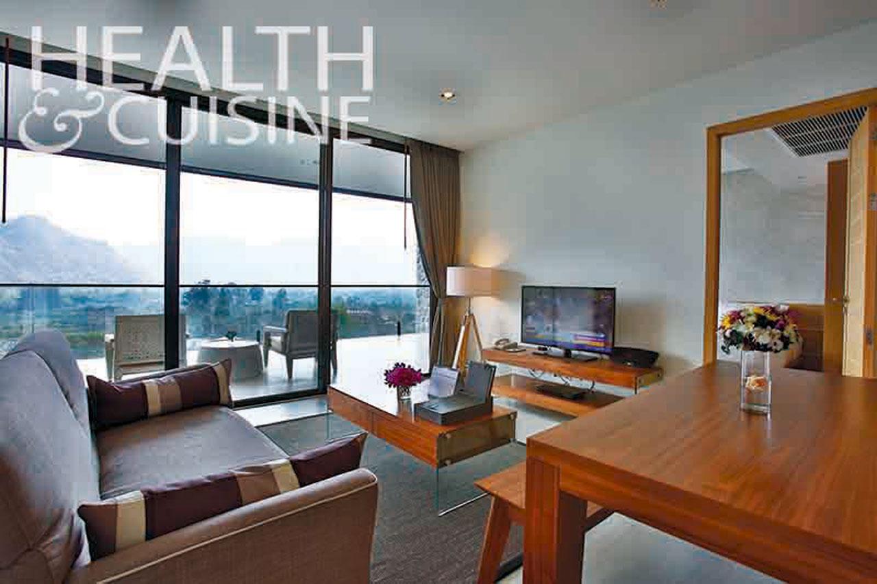 จากนั้นระหว่างวันจะเลือกทำกิจกรรมชิลๆ อย่างอ่านหนังสือรับลมเย็นที่ริมระเบียงห้องก็ดีงาม ไม่ต้องกลัวว่ามาแล้วจะไม่ได้นอนดูวิวสวยนะจ๊ะ ห้องพักที่นี่สามารถมองเห็นวิวต้นไม้เขียวขจีได้ทุกห้อง อ่านหนังสือจนเมื่อยก็ละสายตามามองทิวเขาได้ตลอด (บอกเลยชิลมาก-ก-ก) ส่วนใครชอบออกกำลังเขาก็มีฟิตเนสไว้บริการ หรือจะไปว่ายน้ำในสระก็มีให้เลือกถึง 2 แบบ ทั้งสระขนาดใหญ่ที่อยู่ด้านล่างอาคาร ซึ่งสวยจนเราอดไม่ได้ต้องขอถ่ายรูปเซลฟี่จากวิวนี้ ที่เห็นน้ำใสๆ