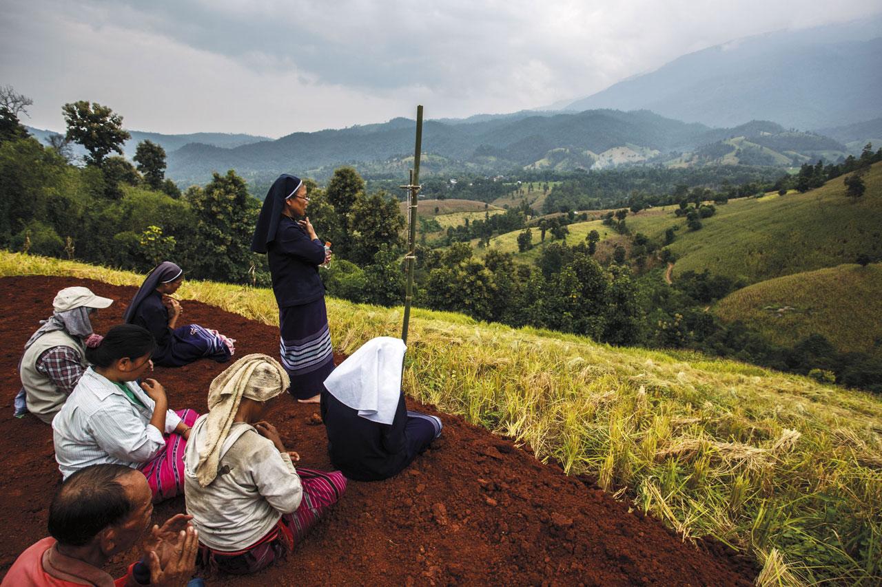 สายวันหนึ่งเราติดตามคณะซิสเตอร์ออกจากหมู่บ้าน เดินเท้าไปตามสันเขาที่ปกคลุมไปด้วยไร่ข้าวโพด ไต่ความสูงลัดเลาะขึ้นไปจนถึงยอดเขาบ้านป่าตึง บนนั้นเป็นแปลงปลูกข้าวไร่ เราเห็นพิธีกรรมเพาะปลูกของชาว ปกาเกอะญอ ผสมผสานระหว่างความเชื่อดั้งเดิมกับความเชื่อแบบคาทอลิก