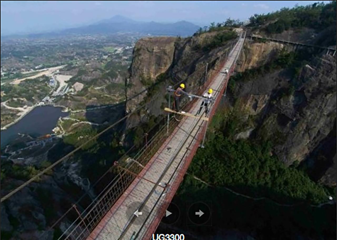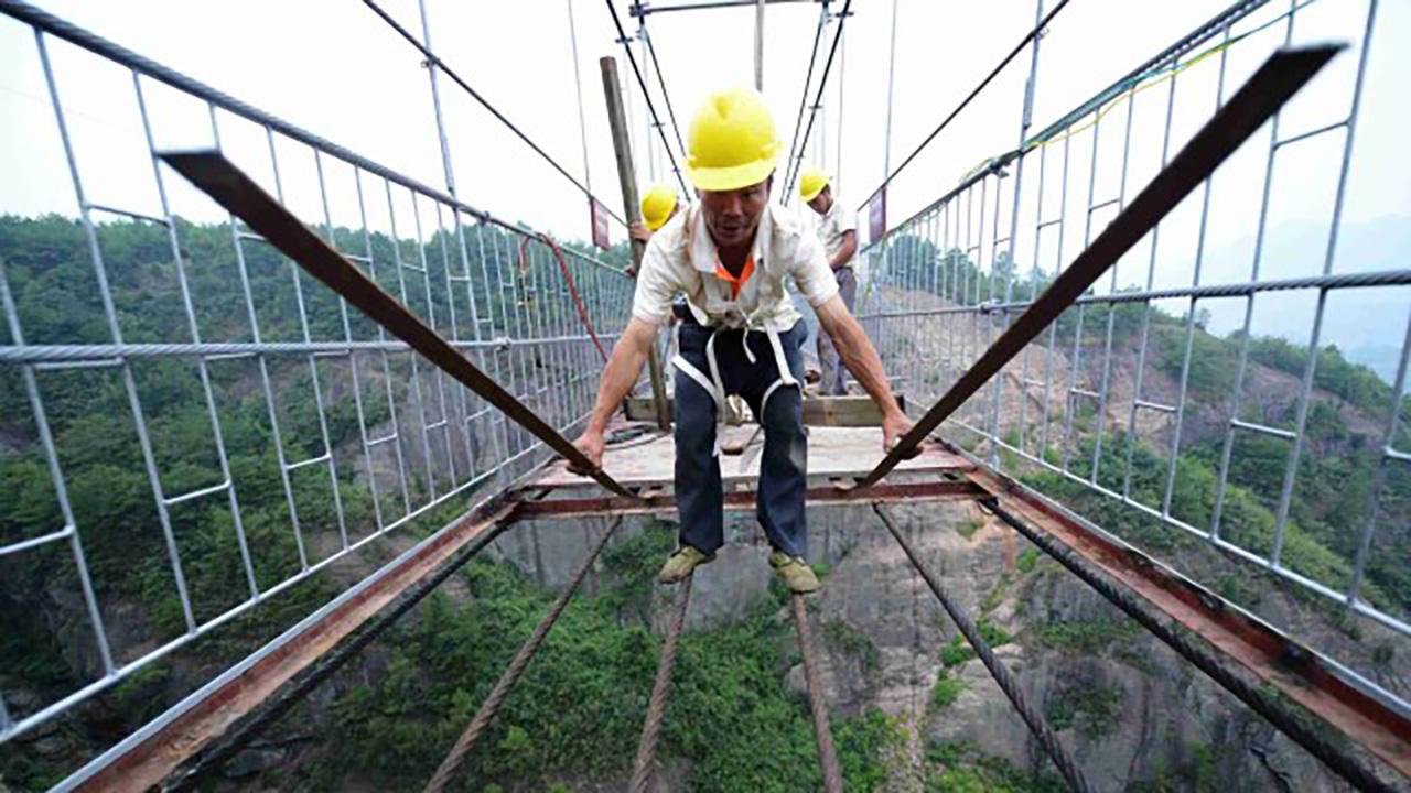 ส่วน กว๋อหง หนึ่งในคนงานบอกเพิ่มเติมว่า เขาต้องค่อยๆ ติดตั้งแผ่นกระจกจำนวนถึง 10 แผ่นในเวลา 1 วันให้เสร็จ ซึ่งในขณะที่สะพานกำลังก่อสร้างอยู่นี้ พวกเขาต้องเผชิญกับสภาพอากาศที่แปรปรวนทำให้สะพานแกว่งไกวอยู่ทุกก้าวในขณะก่อสร้าง