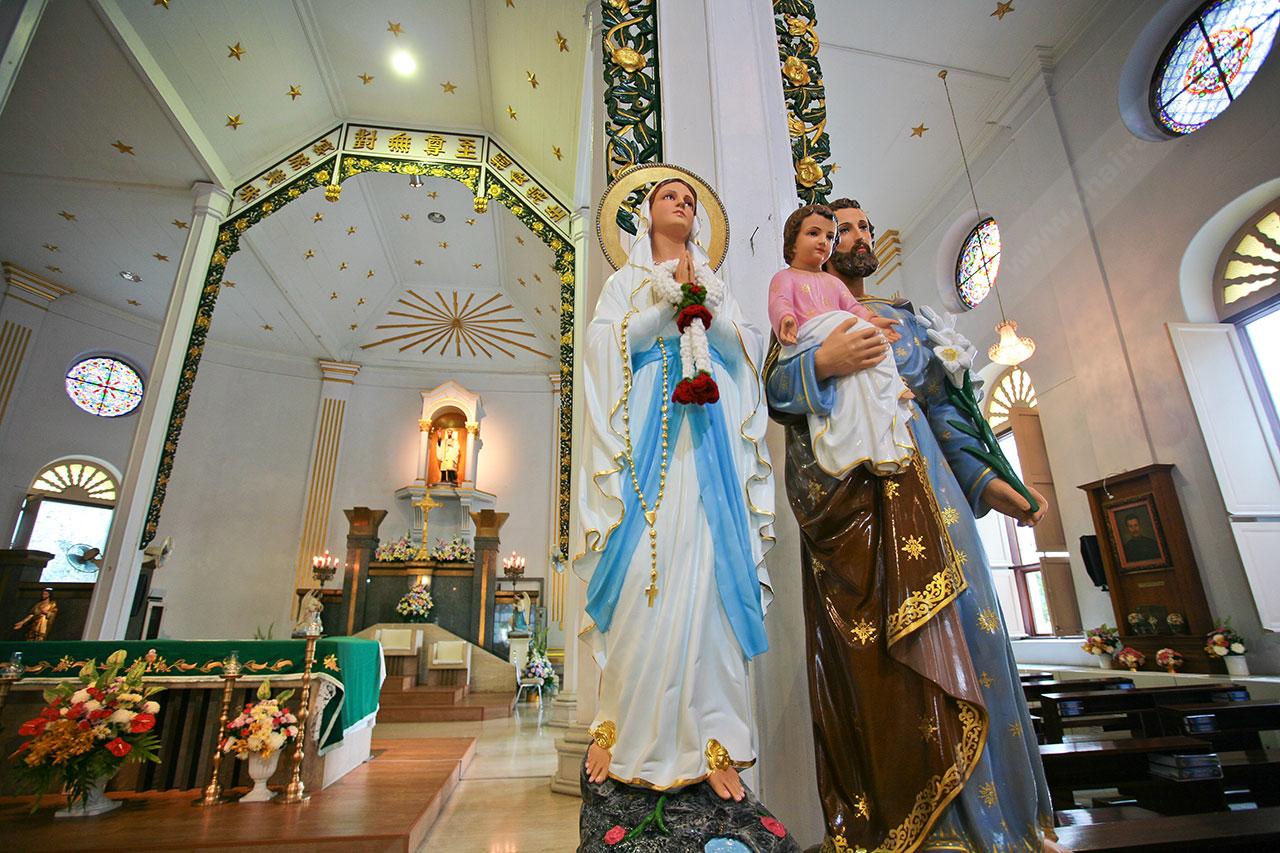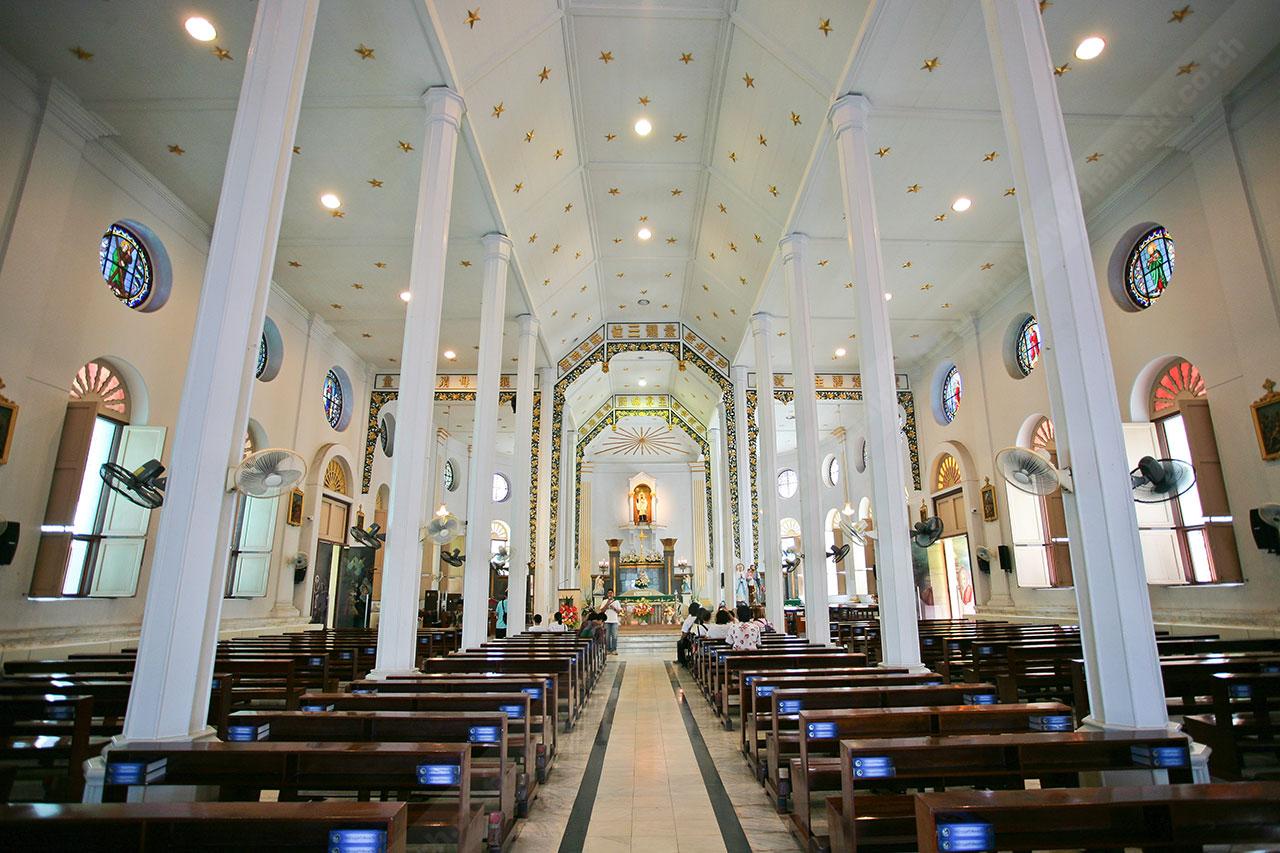 เดินชมรอบๆ จะเห็นสถาปัตยกรรมแบบยุโรปโบราณสวยงาม มีกระจกสีด้านบนเป็นรูปนักบุญต่างๆ และมีกรอบกระจกใสแกะสลักเป็นเรื่องราวของพระเยซู อยู่รอบๆ อาคาร ด้านในมีรูปปั้นของพระแม่มารี และรูปปั้นนักบุญฟรังซิสเซเวียร์ ประดิษฐานอยู่ ส่วนด้านนอกก็มี รูปหล่อสำริดของพระเยซูกำลังรักษาชายตาบอด ให้กลับมามองเห็นได้อีกครั้ง ซึ่งถือเป็นปาฏิหาริย์ ชาวคริสต์นิยมมาสักการะขอพรเกี่ยวกับเรื่องสุขภาพ