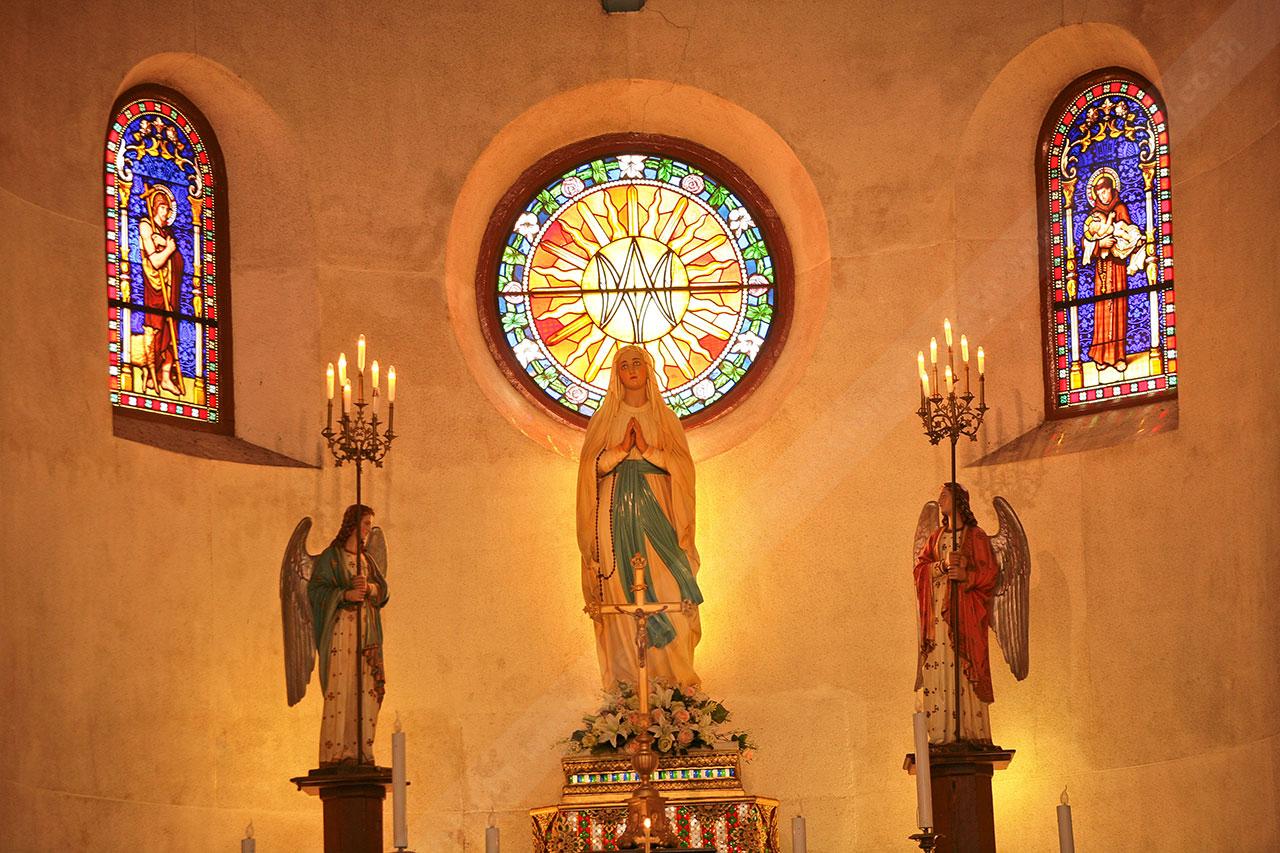 ภายในโบสถ์มีขนาดเล็ก แต่ก็งดงามขรึมขลัง ตามผนังมีภาพเขียนเล่าเรื่องเกี่ยวกับพระเยซู ส่วนด้านนอกวัดมีสิ่งปลูกสร้างคล้ายถ้ำ ซึ่งมีองค์พระแม่มารีประดิษฐานอยู่เช่นกัน ถือเป็นสิ่งก่อสร้างแปลกใหม่ที่บางคนอาจไม่เคยเห็นมาก่อน