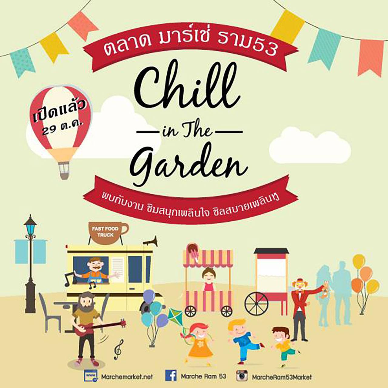 วันที่ 29 ต.ค. - 1 พ.ย. 2558 ชวนมาเที่ยวงาน "Chill in the Garden" ณ ตลาดมาร์เช่ ราม 53 ภายในงานพบกับของกินอร่อยๆ จากคาราวานฟู้ดทรัก เครื่องดื่มหลากหลายชนิด ดนตรีฟังเพลินเบาๆ แนวอะคูสติก เสื้อผ้าแฟชั่น และสินค้าไลฟ์สไตล์มากมาย พิเศษสุด วันที่ 31 ต.ค. และ 1 พ.ย. แจกป๊อปคอร์น สายไหม และมาร์เช่บอลลูนฟรี
