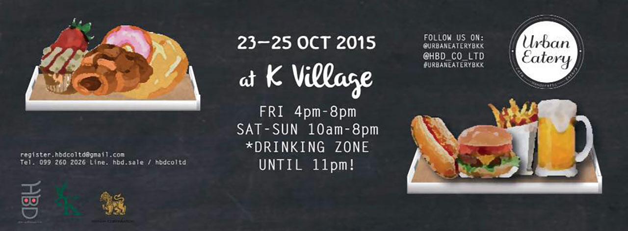 วันนี้ - 25 ต.ค. 2558 มาช็อป ชิม ชิล ในงาน "Urban Eatery" ณ K-Village ภายในงานพบกับ ตลาดนัดสุดเก๋ พร้อมอาหาร เครื่องดื่ม และขนมหวานน่าลิ้มลองมากมาย เช่น เบเกอรีต่างๆ เนื้อย่างข้าวเหนียว หอยนางรมสดพร้อมเครื่องเคียง ไส้กรอกนำเข้า อาหารจานเดียว เสื้อผ้าแฟชั่น ของใช้แนวไลฟ์สไตล์ เครื่องประดับ กระเป๋า รองเท้า และสินค้าไอเดียอีกมากมาย