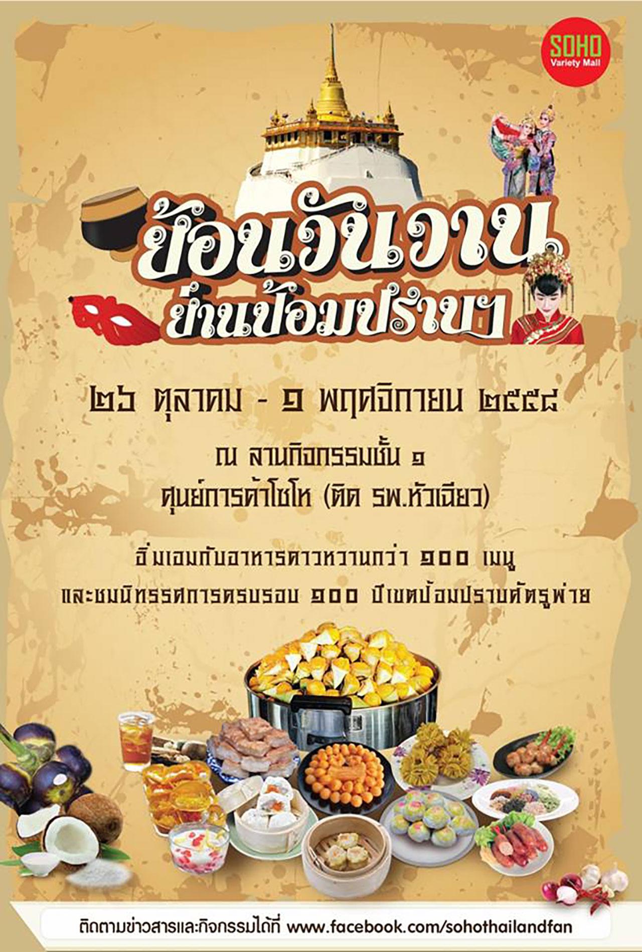 วันที่ 26 ต.ค. - 1 พ.ย. 2558 ชวนคนไทยมาเดินเที่ยวชิลๆ ย้อนวัยกันในงาน "ย้อนวันวาน ย่านป้อมปราบฯ" ณ ลานกิจกรรม ชั้น 1 ศูนย์การค้าโซโห (ติด รพ.หัวเฉียว) ภายในงานพบกับอาหารคาวหวาน กว่า 100 เมนู ที่เป็นของเด่นของอร่อยจากยุคอดีต สืบทอดมาถึงปัจจุบัน และชมนิทรรศการครบรอบ 100 ปี เขตป้อมปราบศัตรูพ่าย เช่น นิทรรศการที่มาของสถานที่ต่างๆ ชุมชนเก่าแก่ บุคคลสำคัญในอดีต เป็นต้น สอบถามเพิ่มเติม โทร. 0 2223 2299