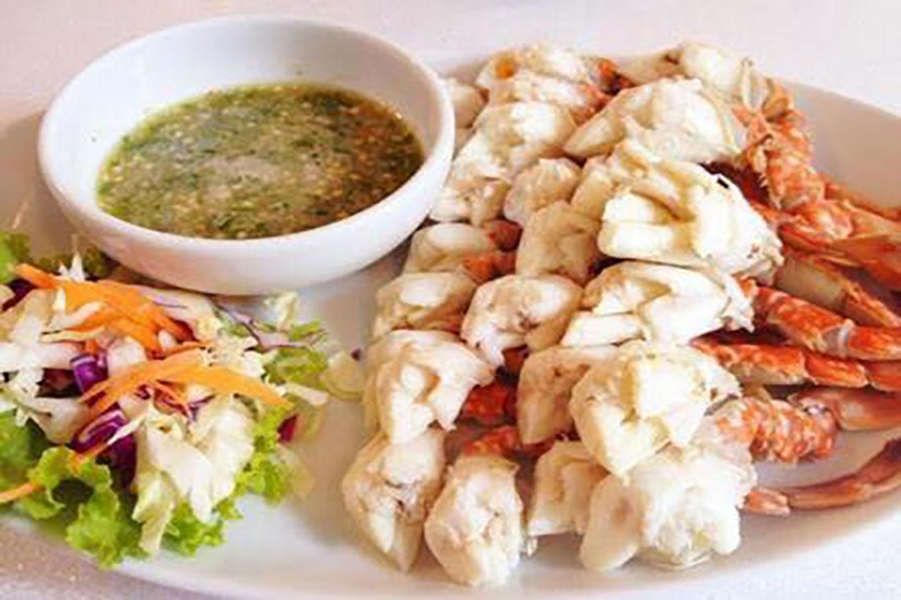 8. ต่อกันด้วย 'ปูม้านึ่งจิ้มซีฟู้ด' จากอ่าวทองคำ ปูม้านึ่งสด หวาน และฉ่ำ กินคู่กับน้ำจิ้มซี้ฟู้ดสูตรชาวอ่าวทองคำ ทีเด็ดอยู่ตรงความเผ็ดจี๊ดจนน้ำหูน้ำตาไหล ส่วนผสมไม่เยอะแค่จับพริกขี้หนูมาผสมกับกระเทียม รากผักชี เกลือ น้ำตาลทราย ที่ขาดไม่ได้คือ น้ำมะนาว เอาอะไรมาแลกก็ไม่ยอม