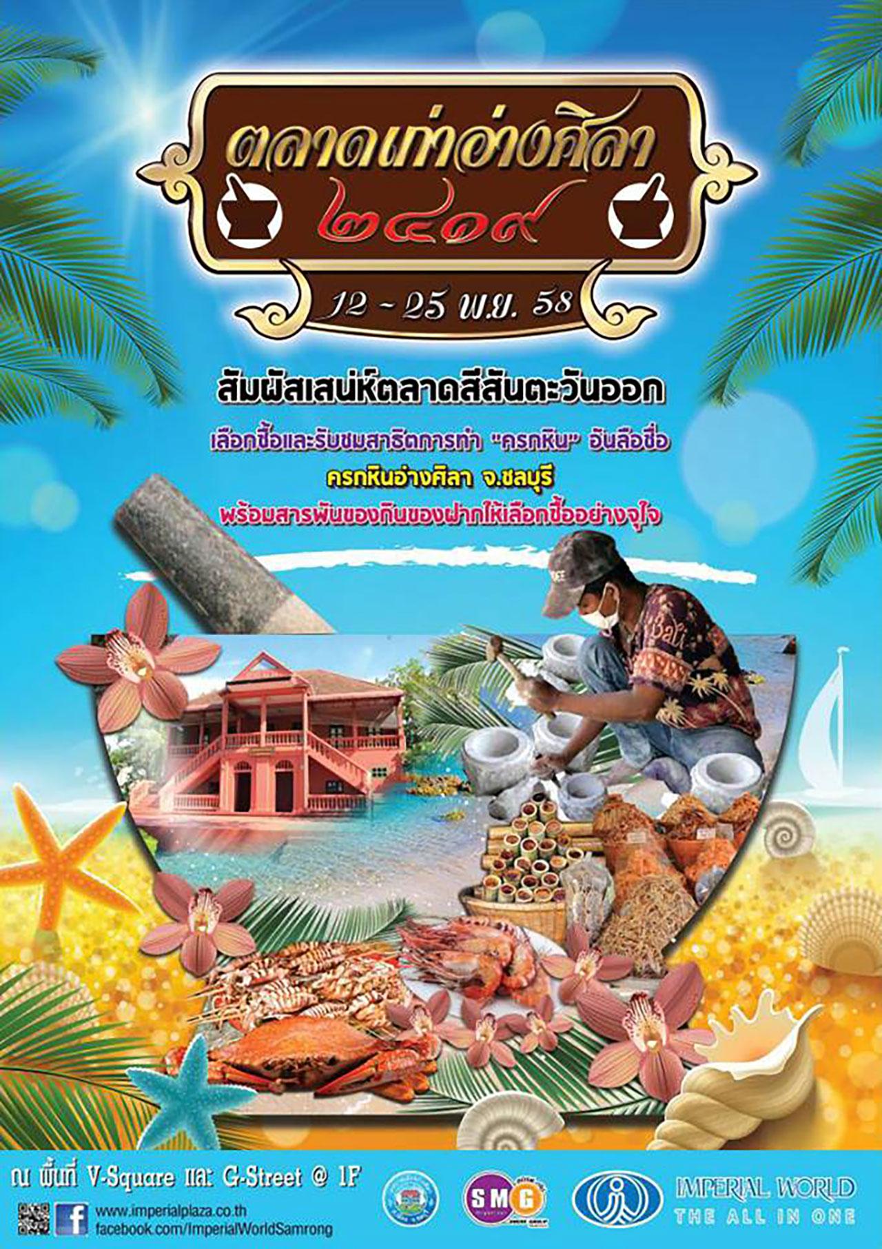 วันนี้ - 25 พ.ย. 2558 ชวนไปเดินเที่ยวชมของดีเมืองอ่างศิลาแบบไม่ต้องไปไกล ในงาน "ตลาดเก่าอ่างศิลา 2419" ณ บริเวณ V-Square และ G-Street ชั้น 1 อิมพีเรียลเวิลด์ ภายในงานพบกับ เสน่ห์ตลาดสีสันตะวันออก เลือกซื้อและรับชมสาธิตการทำ "ครกหิน" สินค้าขึ้นชื่อของ อ.อ่างศิลา จ.ชลบุรี พร้อมสารพัดของกินของฝาก มีทั้งอาหารทะเลสดๆ อาหารทะเลแห้ง อาหารแปรรูป ขนม ข้าวหลามหนองมน เป็นต้น