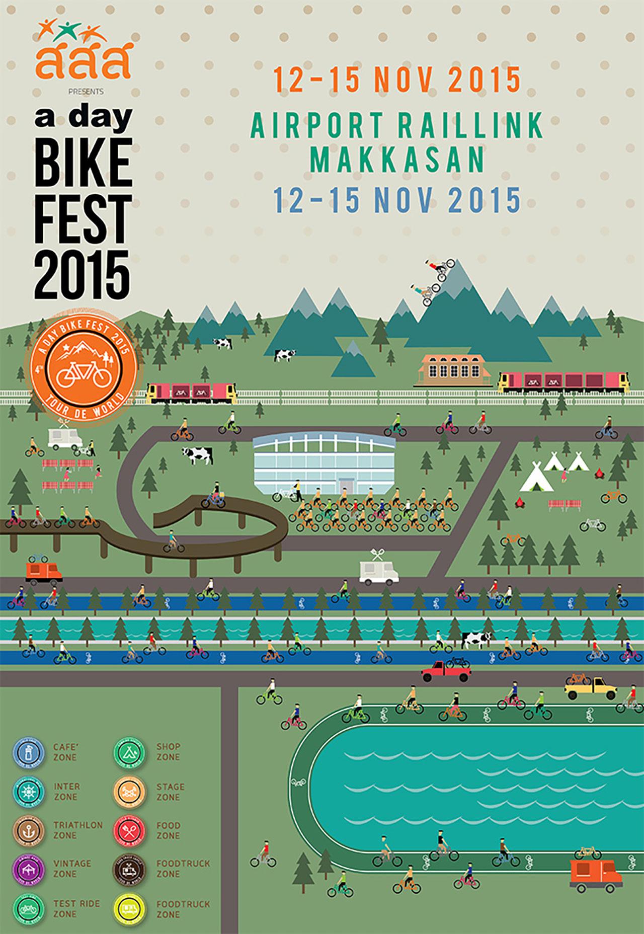 วันนี้ - 15 พ.ย. 2558 ชวนไปเที่ยวงานจักรยานแห่งปีใน "a day Bike Fest 2015" ณ บริเวณ แอร์พอร์ตเรลลิงก์ สถานีมักกะสัน ภายในงานพบกับ Tour de World เทรนด์การปั่นจักรยานเพื่อการท่องเที่ยวที่เกิดขึ้นทั่วโลก สะท้อนไลฟ์สไตล์ของคนรุ่นใหม่ ในการปั่นจักรยานไปท่องเที่ยวตามสถานที่ต่างๆ ทำให้สุขภาพดี ได้เรียนรู้สิ่งใหม่ๆ และกระตุ้นเศรษฐกิจในชุมชน ในงานมีบูธจำหน่ายอุปกรณ์จักรยานต่างๆ มีเวทีพูดคุยให้ความรู้ และการเล่นเกมสนุกๆ มากมาย สอบถามเพิ่มเติม โทร. 08 6338 9448