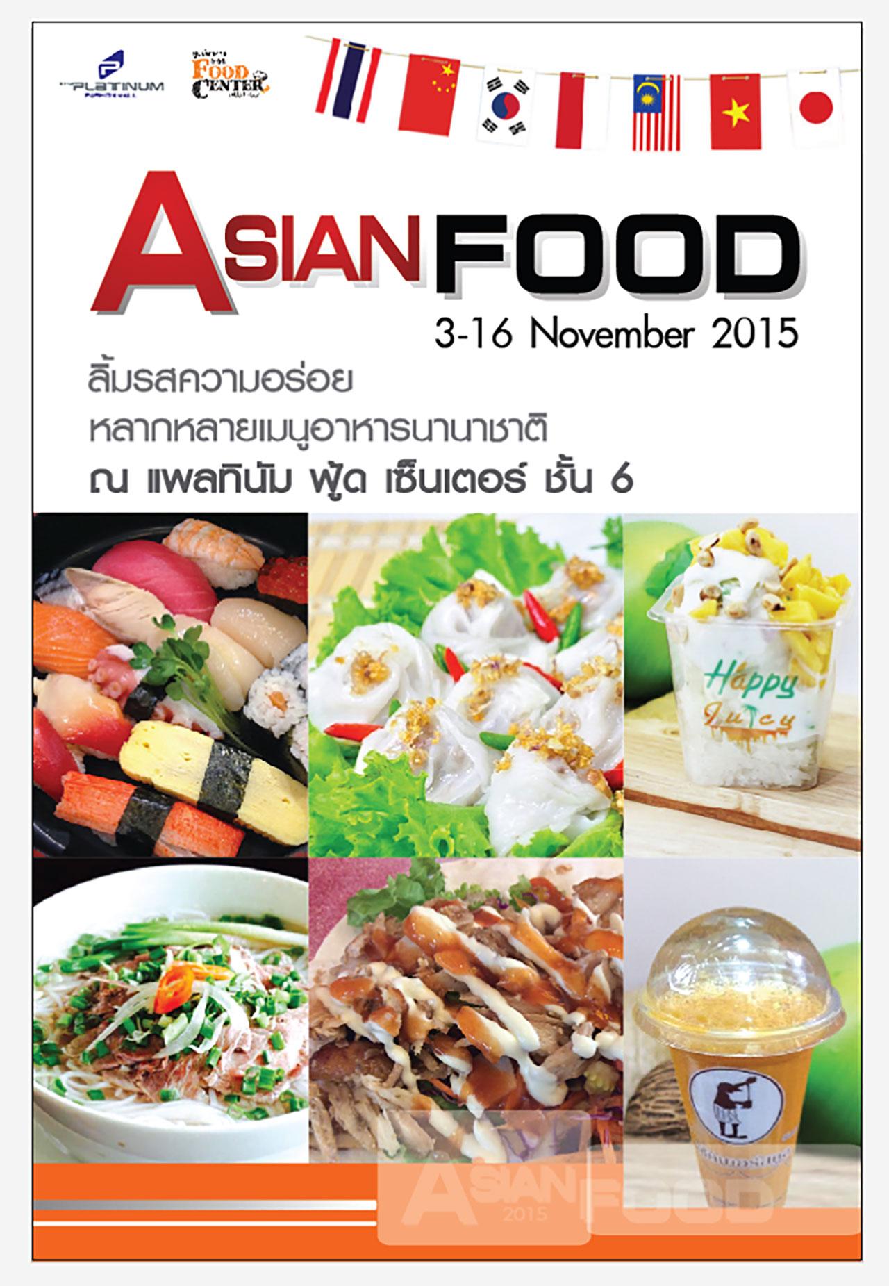 วันนี้ - 16 พ.ย. 2558 ชวนคนไทยไปเปิดประสบการณ์ปากในงาน "Asian Food" ณ ศูนย์อาหารชั้น 6 The Platinum Food Center ภายในงานพบกับอาหารประจำชาติในโซนทวีปเอเชีย ไม่ว่าจะเป็น อาหารเวียดนาม, ซูชิ ประเทศญี่ปุ่น, ไก่ย่าง, เนื้อย่างตุรกี, กุยช่าย, ไอศกรีม, มะม่วง, ไอศกรีมกะทิสด, โรตี, ชาชัก และมะตะบะ เป็นต้น