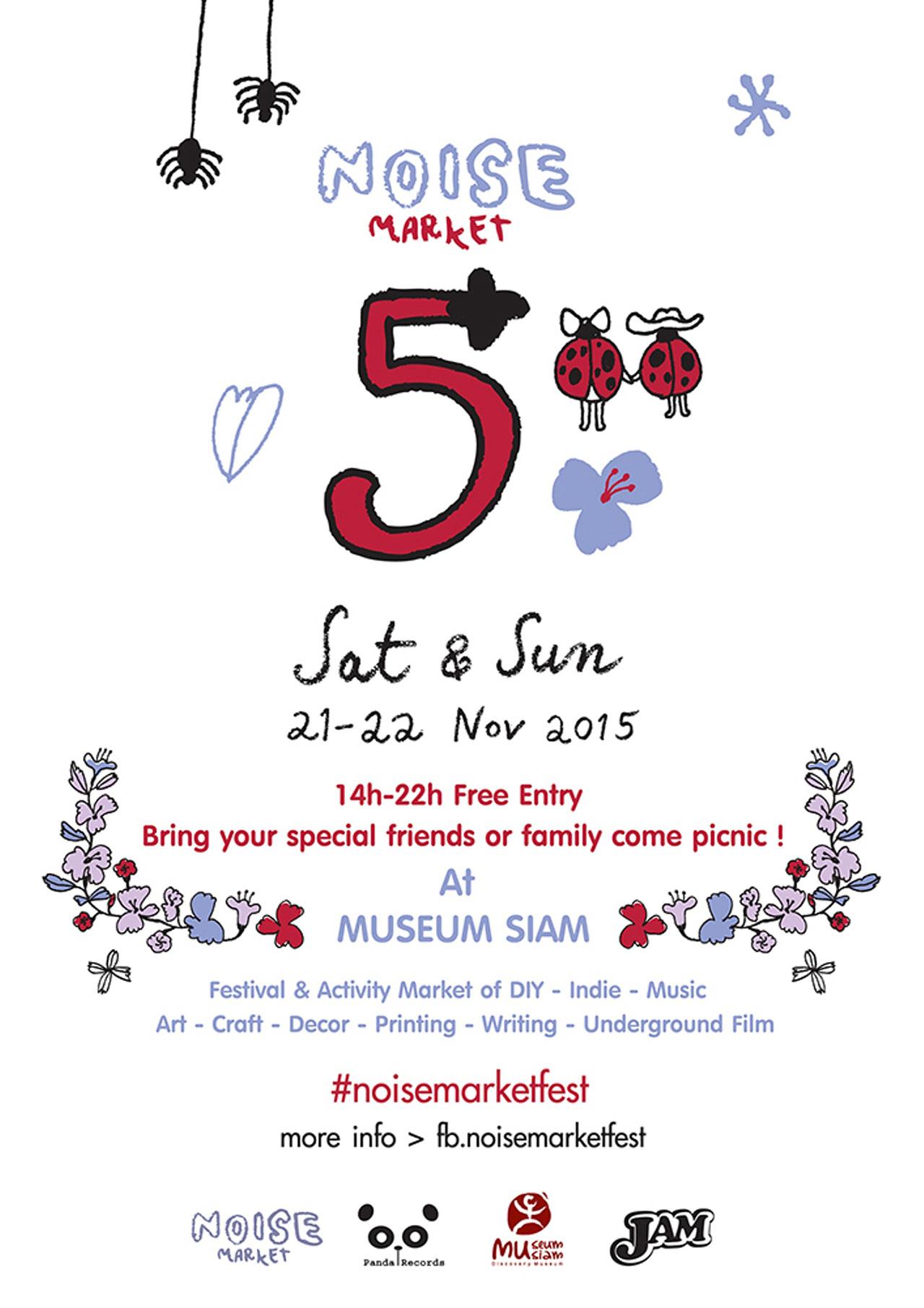 วันที่ 21 - 22 พ.ย. 2558 ชวนคนอินดี้ไปเที่ยวเพลิน เดินช็อป นั่งฟังเพลงรับลมหนาวส่งท้ายปีในงาน "Noise Market 5" ณ มิวเซียมสยาม (ท่าเตียน) ภายในงานพบกับ ตลาดนัดอินดี้ที่มีกิจกรรมมากมาย เพลิดเพลินช็อปชมชิลของใช้ และของแต่งบ้านทำมือกว่า 90 ร้าน เดินชิมอาหารอร่อย ปล่อยใจไปกับดนตรีสดจากศิลปินอิสระกว่า 50 วง เช่น Cyndi Seui วงกู่แคน วง White Shoes & The Couples Company จากอินโดนีเซีย และนอนเอนกายบนสนามหญ้า ดูหนังอันเดอร์กราวด์ สอบถามเพิ่มเติม โทร. 0 2225 2777 ต่อ 408