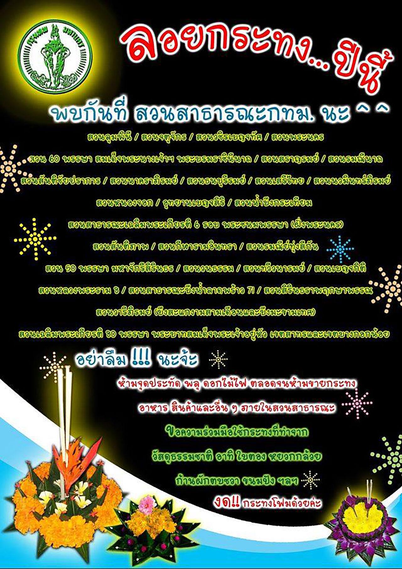 นอกจากนี้กรุงเทพมหานครขอความร่วมมือประชาชนใช้กระทงที่ทำจากวัสดุธรรมชาติหรือย่อยสลายง่าย เป็นมิตรกับสิ่งแวดล้อม ช่วยลดปริมาณขยะตกค้าง รวมทั้งห้ามจุดประทัด พลุ ดอกไม้เพลิงภายในสวนสาธารณะโดยเด็ดขาด สอบถามเพิ่มเติม โทร. 0-2225-7612-4