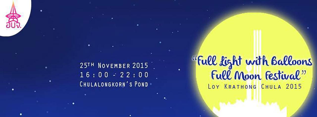 วันที่ 25 พ.ย. 2558 ชวนหนุ่มสาวมาร่วมงาน "Full Light with Balloons Full Moon Festival" หรืองานลอยกระทง จุฬาฯ 2015 ณ บริเวณสระน้ำจุฬาฯ และลานพระบรมราชานุสาวรีย์สมเด็จพระปิยมหาราชและสมเด็จพระมหาธีรราชเจ้า