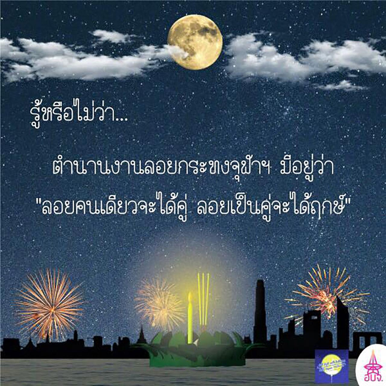 1. ใครหลายคนอาจเคยได้ยินตำนานของงานลอยกระทงที่จุฬาฯ ที่ว่า 'คนโสดจะได้คู่ คบอยู่จะได้เลิก’ อย่าเพิ่งตกใจไป ไม่ใช่ ‘เลิก’ ในที่นี้จริงๆ แล้วหมายถึงฤกษ์งามยามดี