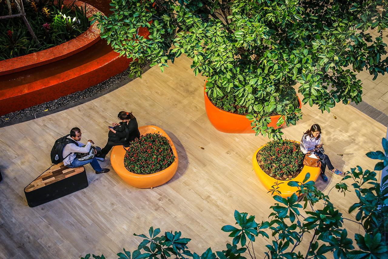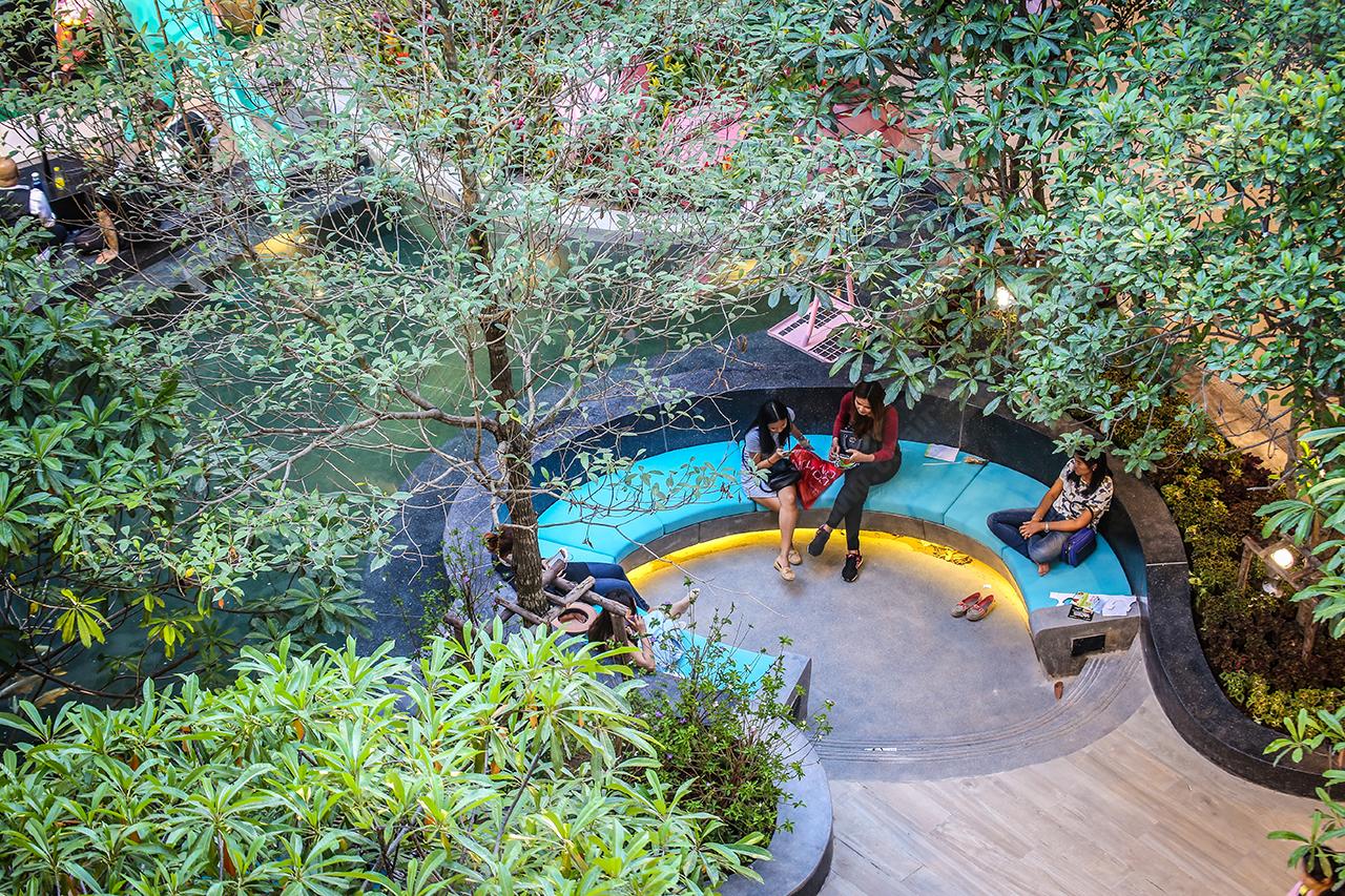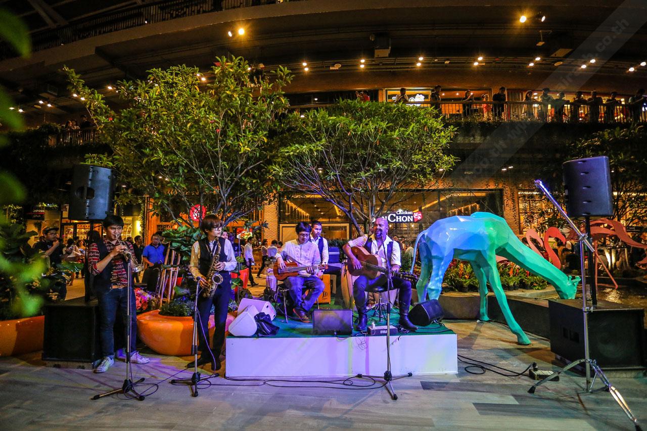 สถานที่สำหรับการพักผ่อน-นั่งชิลเสมือนอยู่ในสวนสาธารณะกว้าง (ใจกลางห้างฯ) ไม่เพียงแต่จะมีหลากหลายที่ให้คุณเลือกนั่ง ทั้งม้านั่งไม้ เบาะโซฟาริมบ่อปลาคาร์ฟ หรือจะเป็นกระถางต้นไม้ขนาดใหญ่ (สำหรับไว้ให้นั่ง) ทว่าถัดไปอีกหน่อยยังมีลานดนตรี Folk song ให้คุณฟังเพลินๆ คลายความเมื่อยล้าจากการจับจ่ายซื้อของมาทั้งวันอีกด้วย หากใครหาสวนบ่อปลาคาร์ฟนี้ไม่เจอ 'นกฟลามิงโก' จะเป็นหนึ่งสัญลักษณ์ที่คุณสามารถมองเห็นสวนนี้ได้โดยง่าย …