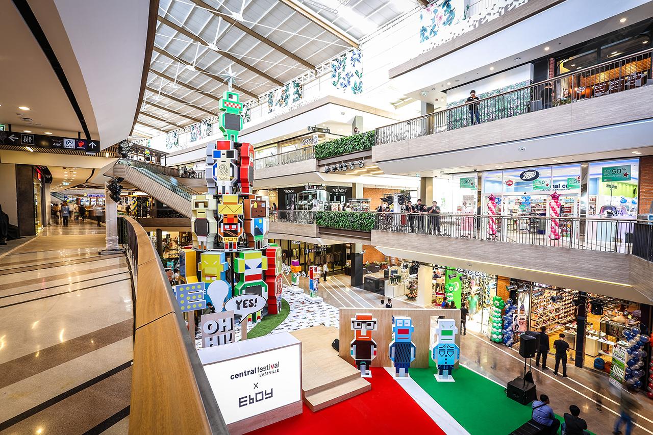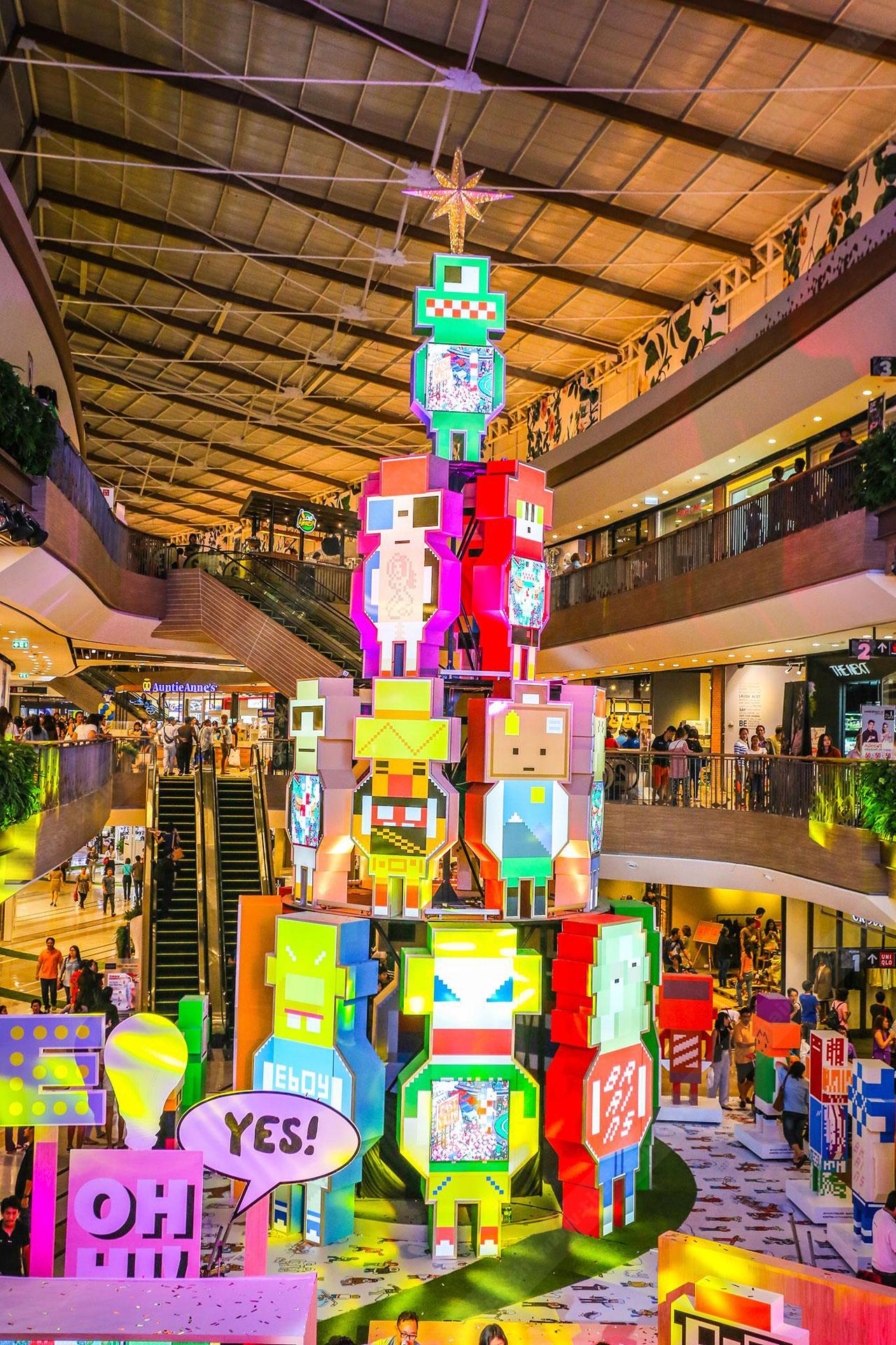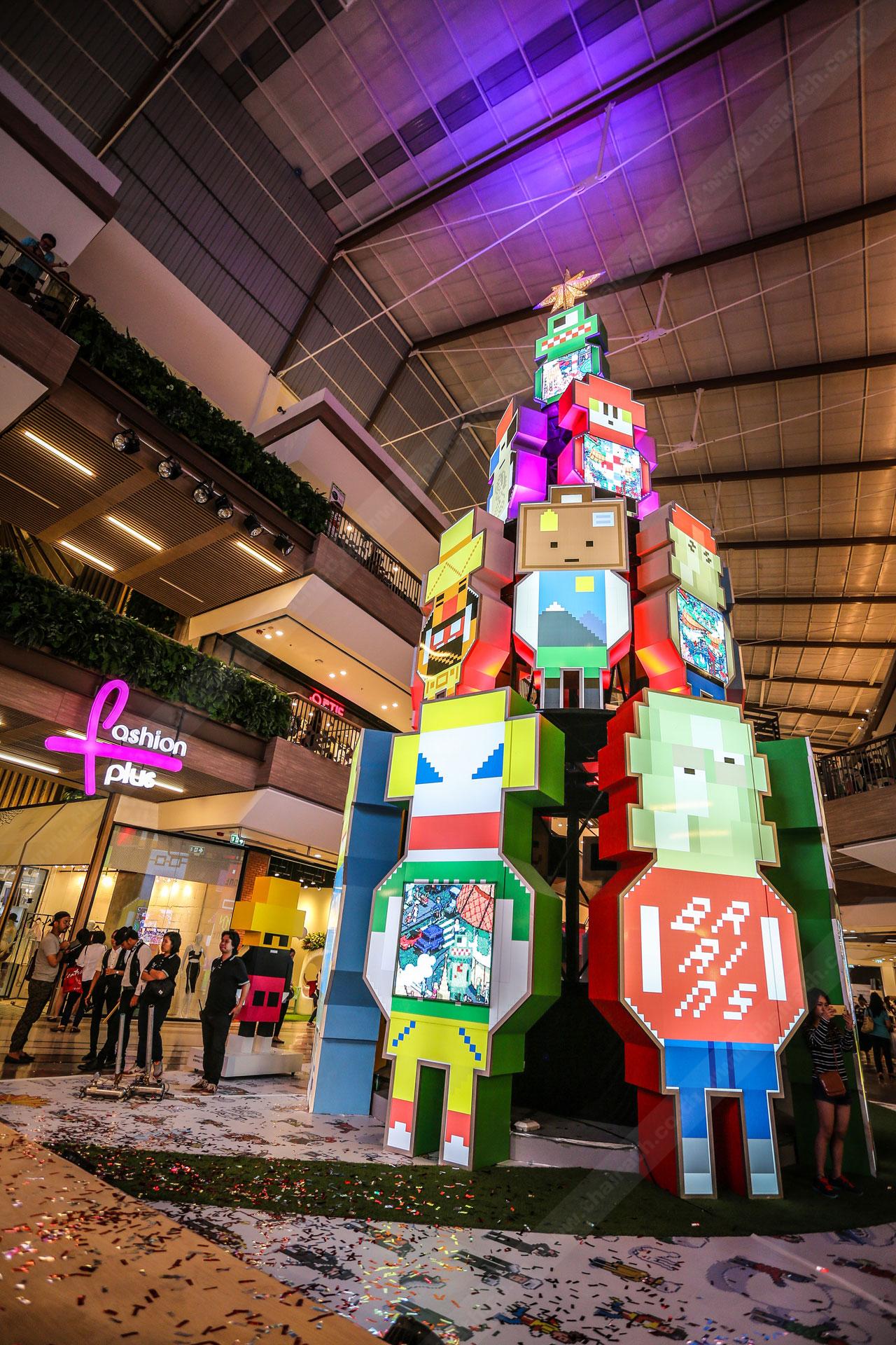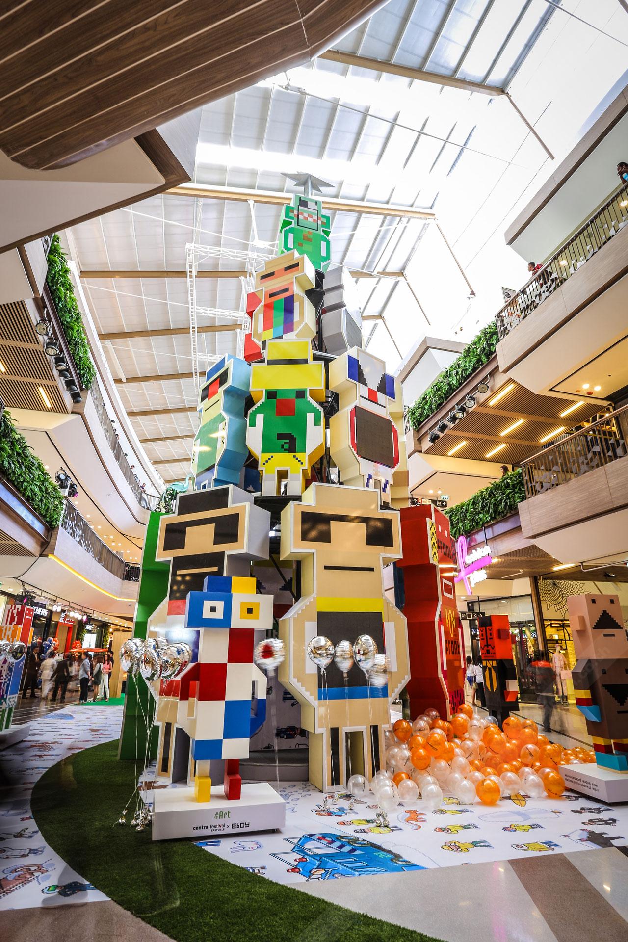 หลายคนอาจเห็นห้างอื่นฯ เฉลิมฉลองเทศกาลคริสต์มาสด้วยต้นคริสต์มาสสีเขียว วางกิมมิกตกแต่งเล็กๆ น้อยๆ พร้อมกล่องของขวัญน้อยใหญ่มากมายใต้ต้นคริสต์มาส ทว่าที่นี่คุณจะได้พบกับต้นคริสต์มาสดีไซน์พิเศษต้นเดียวในโลกที่ทำขึ้นมาจากตัวโรบอตทั้งหมด และอาร์ตเอ็กซิบิชั่นครั้งแรกในเอเชีย จากกลุ่มศิลปิน 'อีบอย' หรือฉายา ก็อดฟาเธอร์ ออฟ พิกเซล (eBoy-Godgather of Pixel) อาร์ติสระดับโลกที่มาสร้างผลงานศิลปะในสไตล์พิกเซล ซึ่งฉายอยู่ในตัวโรบอตต้นคริสต์มาส มันไม่ใช่เรื่องง่ายเลยที่ศิลปินระดับโลกจะมาจัดแสดงผลงานกับศูนย์การค้าในไทยได้ ฉะนั้นอย่ารอช้าที่จะมาดู แล้วคุณจะเห็นว่ามันอเมซิ่ง-เจ๋งแค่ไหน !